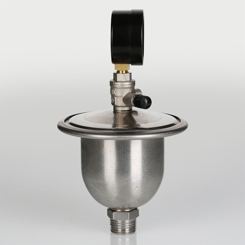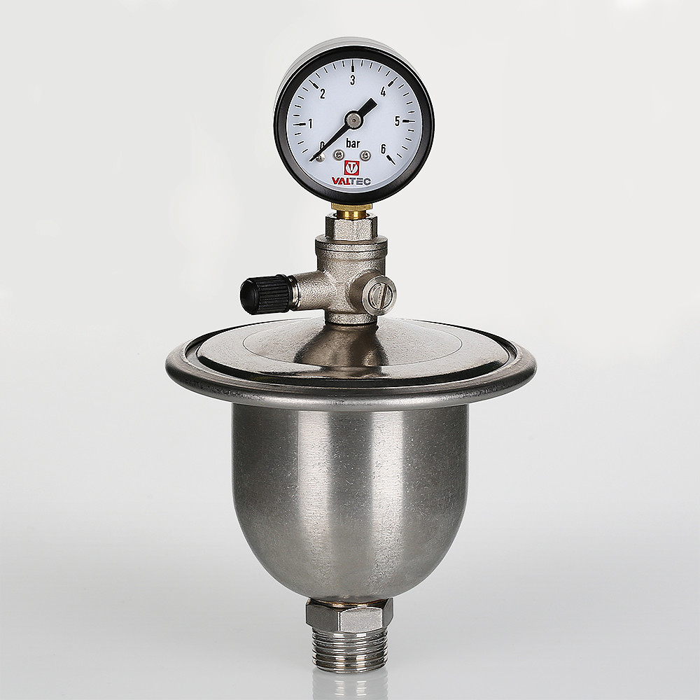 (VT.CAR20.I) Гаситель гидроударов мембранный с манометром VT.CAR20 является продолжением хорошо зарекомендовавшей себя в эксплуатации модели VT.CAR19. Основная особенность новой модификации – возможность оперативного контроля давления в воздушной камере. Это очень важно, ведь если давление в камере опустится ниже расчетного, гаситель не сможет полноценно выполнять свои функции (кроме сглаживания гидравлических ударов, прибор принимает в себя объем воды, образовавшийся при нагревании поступившей в квартиру холодной воды).