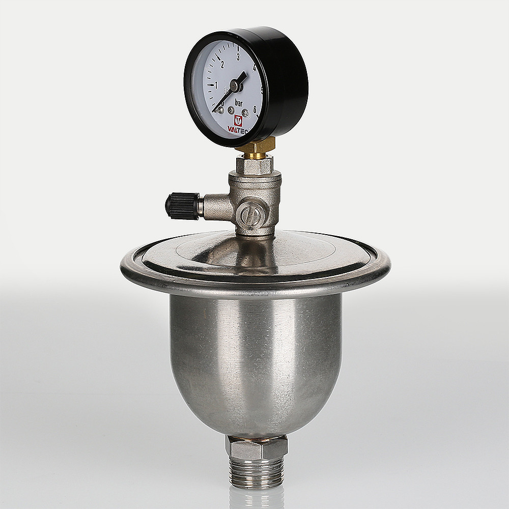Для контроля работоспособности гасителя гидравлических ударов VT.CAR20 в конструкцию ниппельного штуцера введен миниатюрный шаровой кран с манометром. Жилец в любой момент может открыть шаровой кран и проверить давление в воздушной камере гасителя.