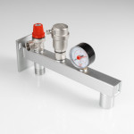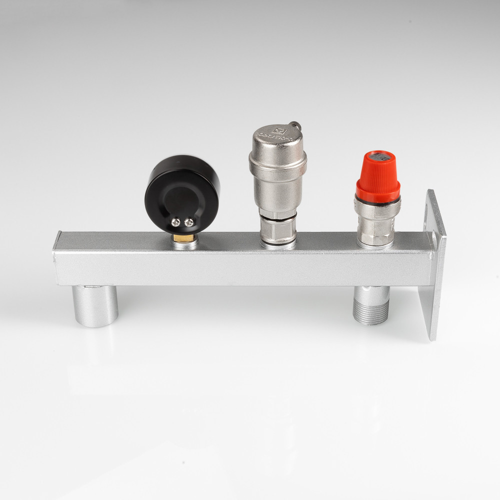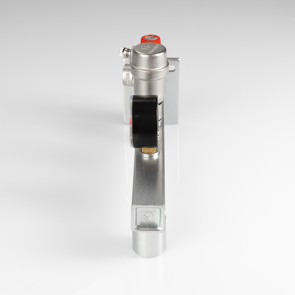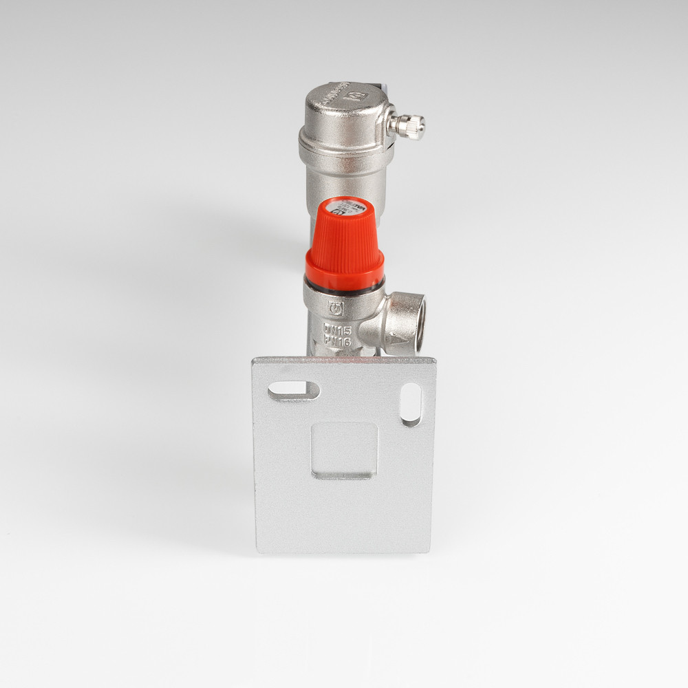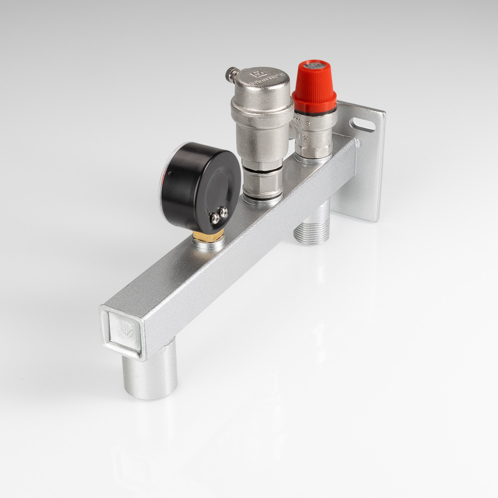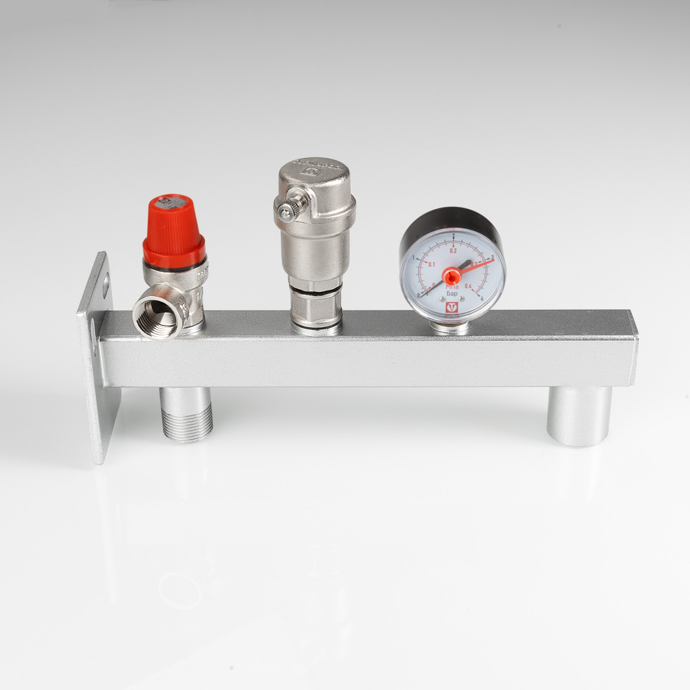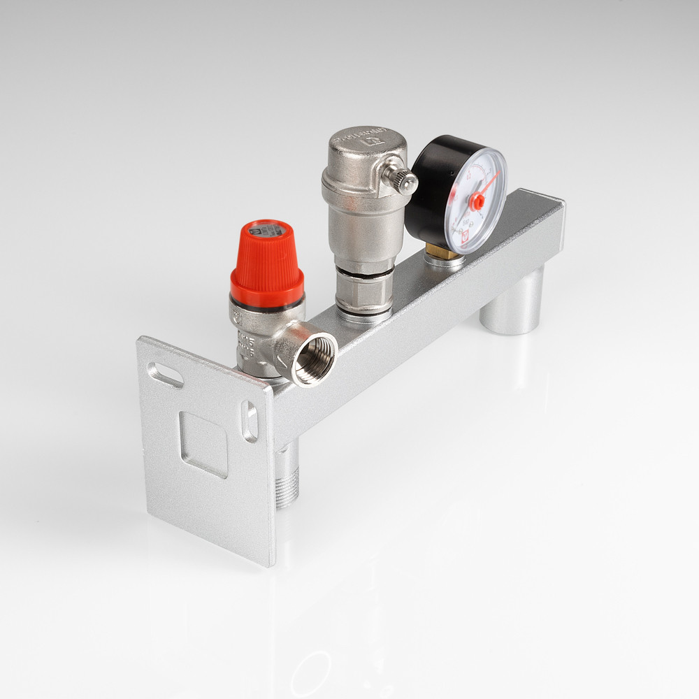 (VT.495.0) Группа безопасности стальная консольная (группа безопасности расширительного бака) представляет собой смонтированные на полой консоли из оцинкованной стали предохранительный клапан с фиксированной настойкой, автоматический воздухоотводчик, манометр со шкалой 0–4 бар. Консоль оборудована резьбовыми патрубками – присоединительным и для мембранного бака, фланцем настенного крепления. Непосредственно к группе допускается подвешивать «мембранник» объемом до 50 л. Оборудование рассчитано на применение в системах тепловой мощности до 44 кВт (увеличивается заменой предохранительного клапана); номинальное давлением – 10 бар; максимальная температура рабочей среды (вода, пар, незамерзающий теплоноситель с концентрацией гликоля не выше 50 %) – 120 °C. Функциями изделия являются защита системы отопления/ГВС от превышения давления, завоздушивания, индикация текущего значения давления, крепление мембранного бака.