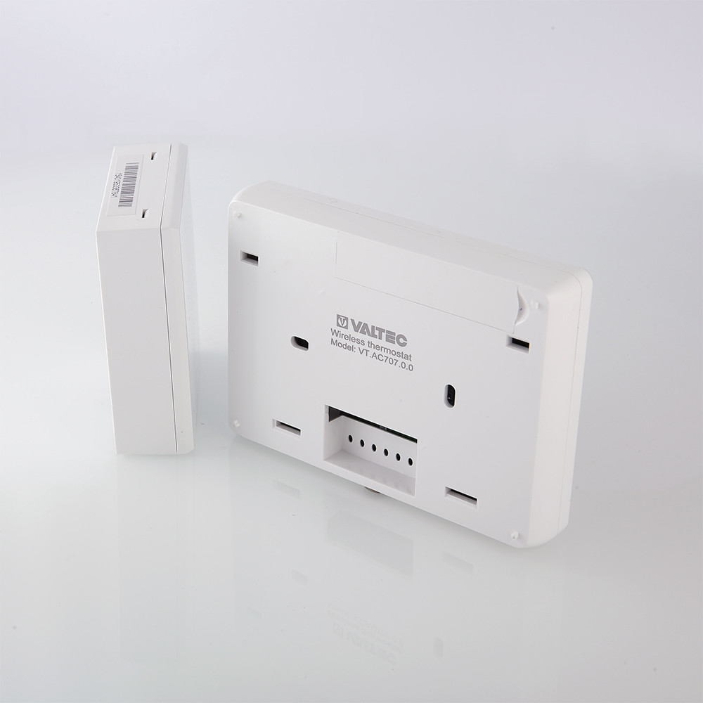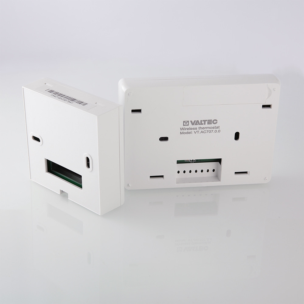 (VT.AC707.0) Комнатный беспроводной хронотермостат VT.АС 707 предназначен для автоматического регулирования и поддержания программно заданной температуры воздуха в обслуживаемом помещении путем подачи управляющего сигнала на элементы климатических систем (теплогенератор, сервопривод, насос, вентилятор и т.п.).