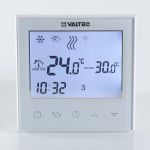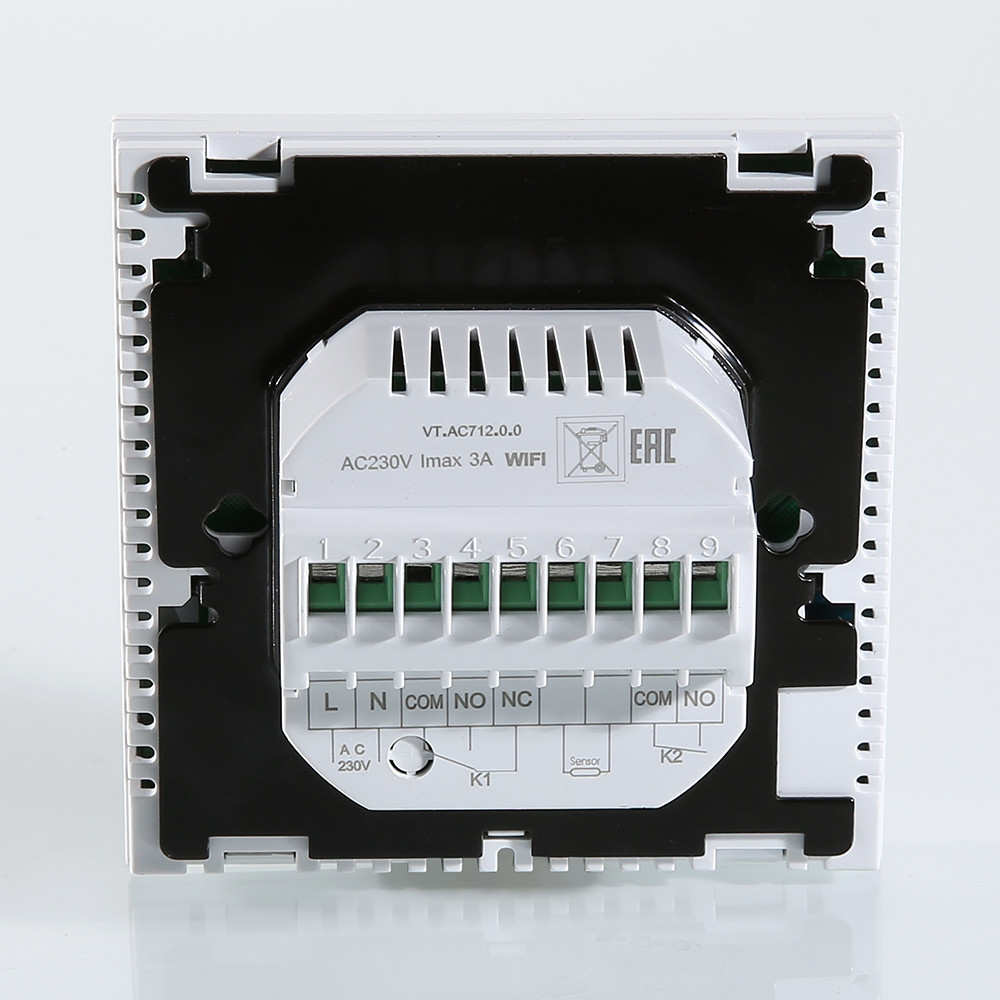(VT.AC712.0) Хронотермостат электронный комнатный с Wi-Fi (Wi-Fi-хронотермостат) предназначен для подачи управляющего сигнала (включить/выключить) на регулирующие устройства водяного теплого пола или радиаторного отопления. Управление осуществляется в зависимости от температуры воздуха в помещении (встроенный датчик) и температуры пола (выносной датчик, входит в комплект). Возможны недельное программирование и выбор режима работы – по датчику температуры воздуха или датчику температуры пола.