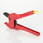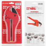 (VTm.394.M) Ножницы с храповым механизмом для металлополимерных и пластиковых труб (до 26 мм) обеспечивают перпендикулярное разрезание трубы без деформации её стенок. Это достигается конфигурацией опорной скобы, поступательным движением ножа, поднятие которого происходит при разведении рукояток. Кроме зубчатого храпового механизма ножницы оснащены лезвием из закаленной стали, рычажным открывающим механизмами, фиксирующей защелкой. Изделие рекомендуются для работы с трубами диаметром до 26 мм.