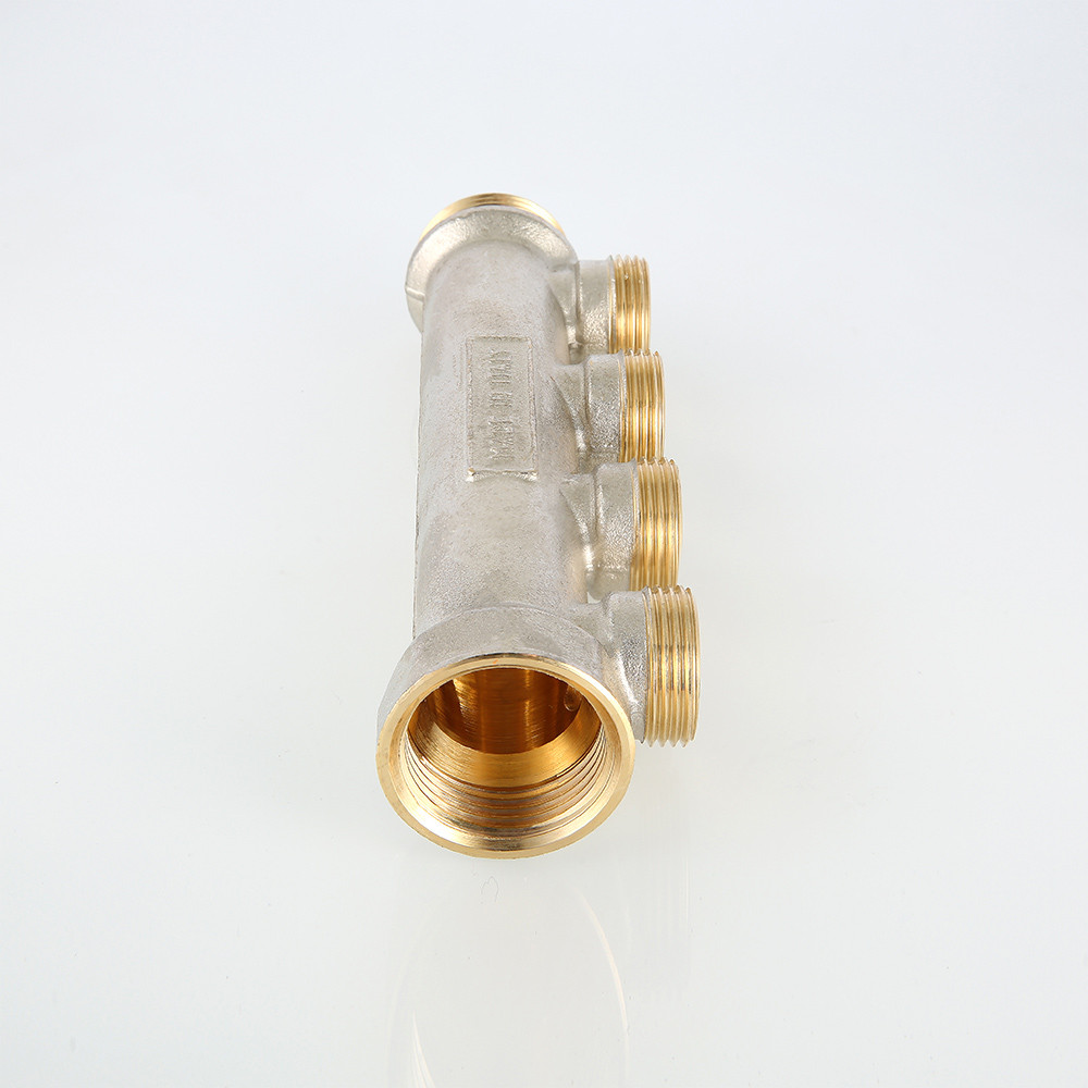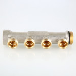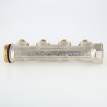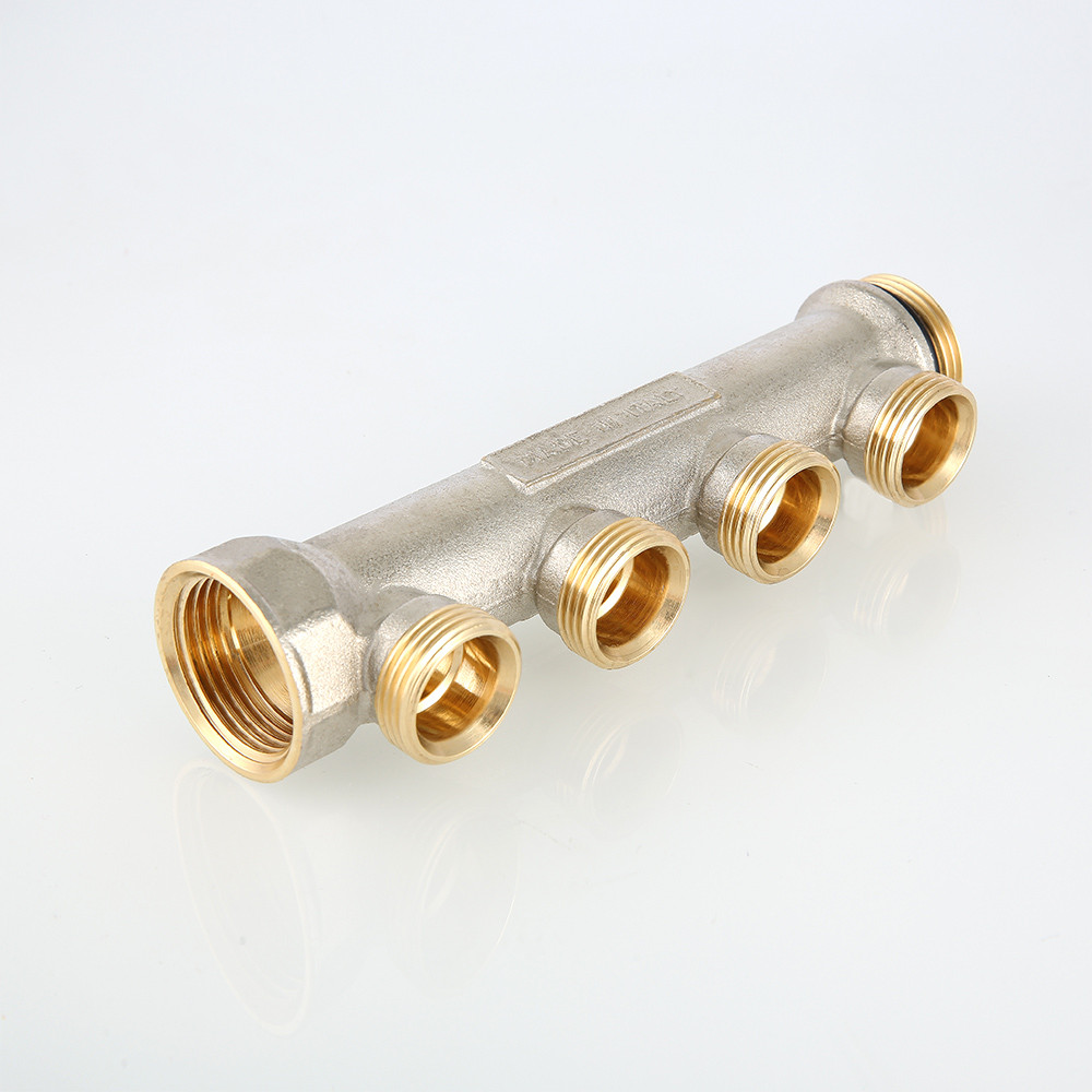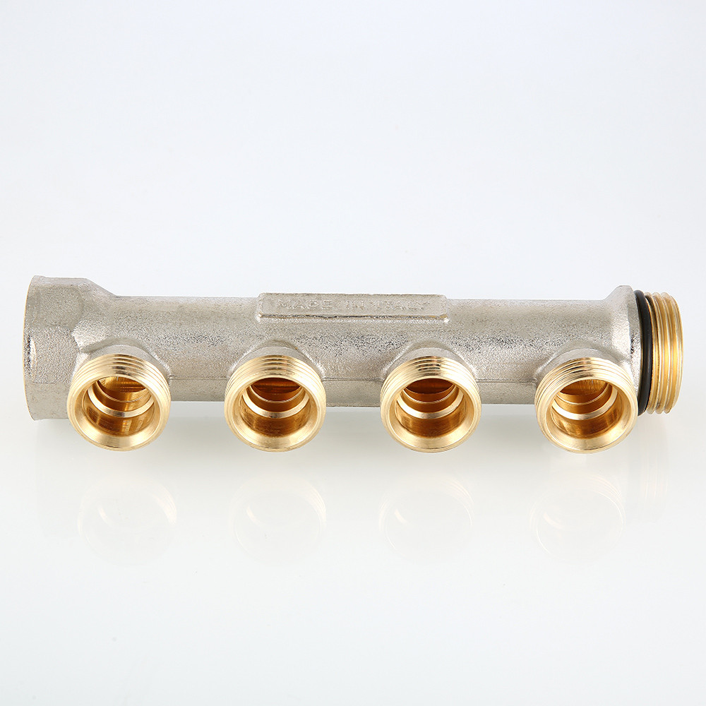 (VTc.500.NE) Латунный никелированный коллектор на 2, 3 или 4 выхода диаметром 3/4" с наружной резьбой, стандарт присоединения – «евроконус». Диаметр коллектора – 1", резьба – внутренняя/наружная. Рабочая температура теплоносителя – до 130 °С, давление – до 16 бар. Применяется для распределения потоков жидкостей в контурах теплого пола, радиаторного отопления, холодного и горячего водоснабжения.