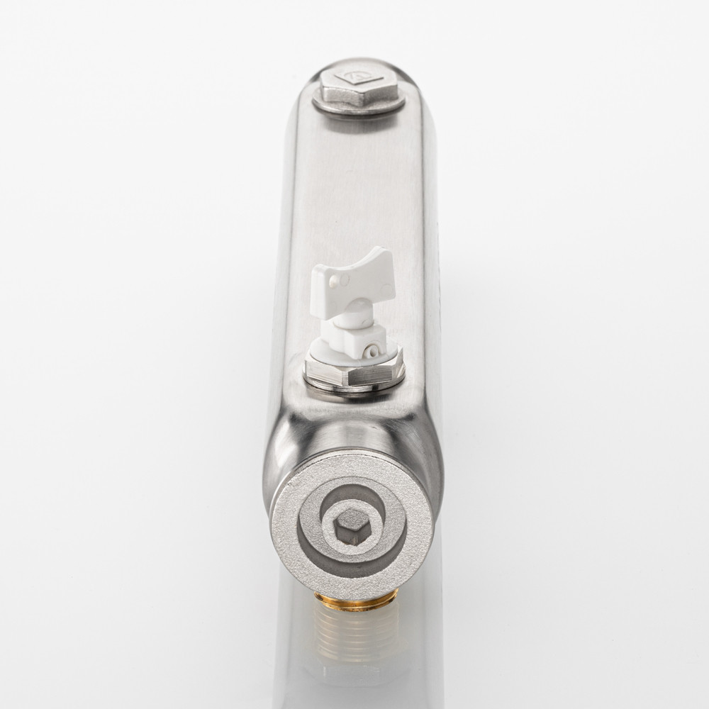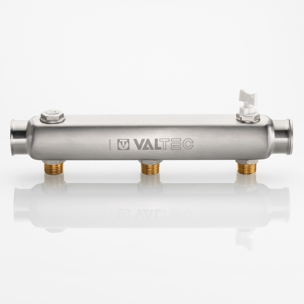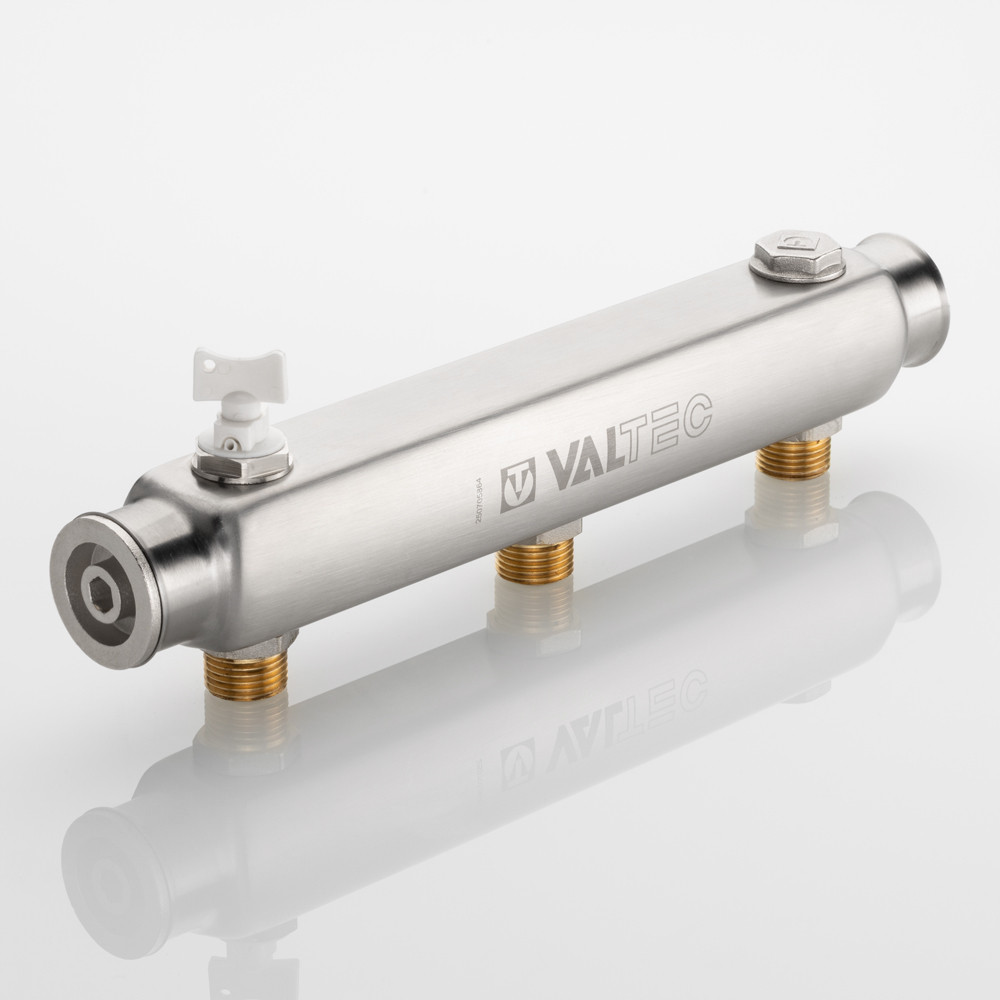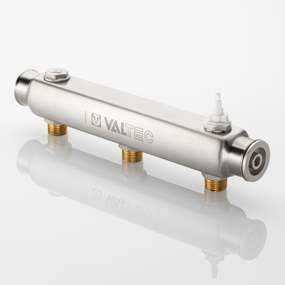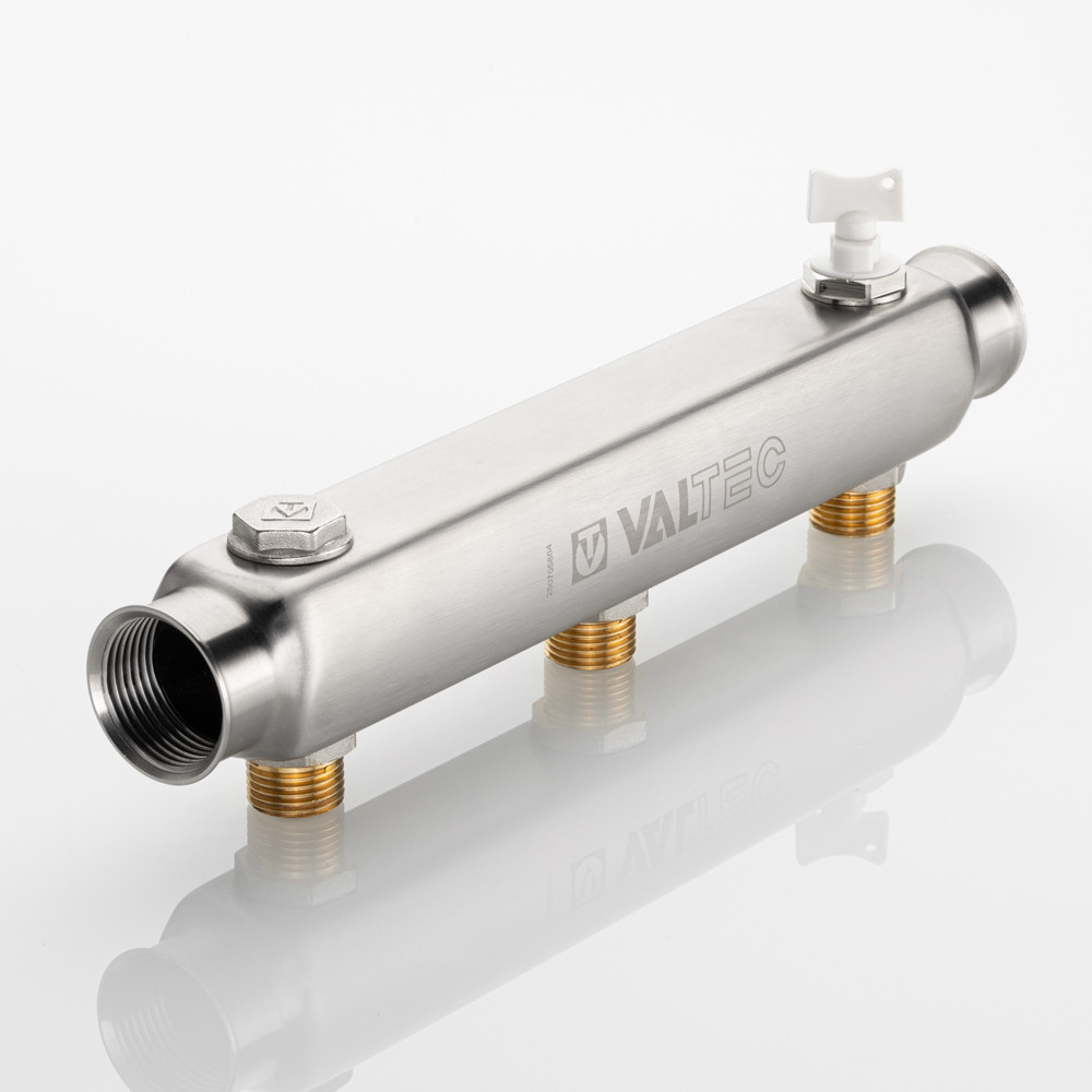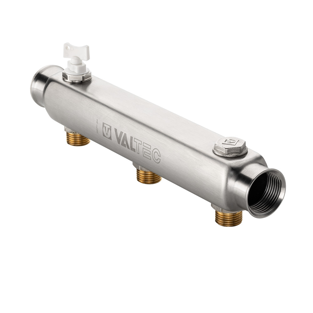 (VTc.510.SS) Коллектор из нержавеющей стали с увеличенным до 100 мм шагом отводящих патрубков. Предназначен для групповой установки квартирных водосчетчиков в этажных узлах учета многоквартирных зданий. Резьба отводящих патрубков – наружная, 1/2 или 3/4". Резьба коллектора – внутренняя, 1 или 1 1/2". В комплект входит резьбовая пробка для коллектора. Коллекторы рассчитаны на рабочее давление 10 бар и максимальную температуру рабочей среды 130 °С. Средний полный срок службы изделия – 50 лет.