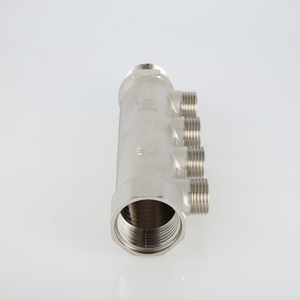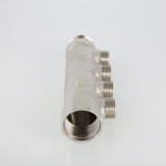 (VTc.500.N) Латунный никелированный коллектор на 2, 3 или 4 выхода диаметром 1/2" с наружной резьбой. Диаметр коллектора – 3/4 или 1", резьба – внутренняя/наружная. Рабочая температура теплоносителя – до 130 °С, давление – до 16 бар. Применяется для распределения потоков жидкостей в контурах теплого пола, радиаторного отопления, холодного и горячего водоснабжения.