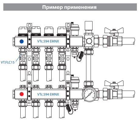 Правильное направление потока жидкости указано на корпусе расходомера стрелкой. В установке напольного обогрева прибор монтируется на отводы обратного коллектора. При использовании совместно с коллекторным блокам VTc.594 гидравлическая настройка системы осуществляется встроенными регулировочными клапанами при помощи ключа SW5.