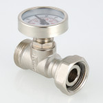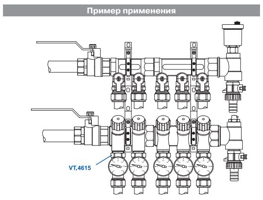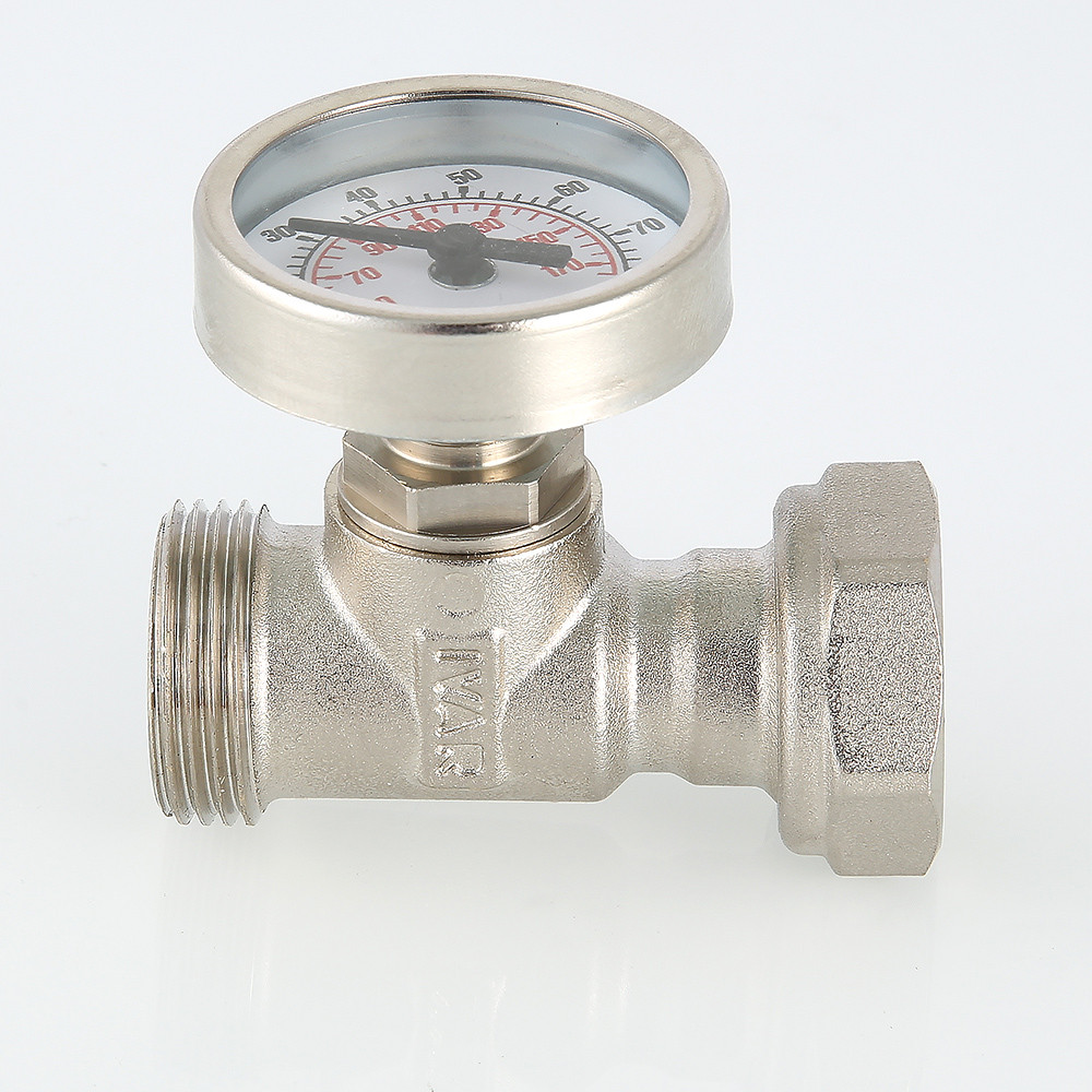 (VT.4615.0) Тройник с термометром предназначен для контроля температуры теплоносителя в трубопроводных петлях теплого пола или другой инженерной системы. Подключение к коллектору – по стандарту «евроконус» (имеется накидная гайка), резьба для присоединения трубопровода – наружная, 3/4". Тройник выполнен из латуни марки CW617N, никелирован; материал уплотнений – синтетический каучук EPDM. Может устанавливаться как на падающий, так и на обратный коллектор. Укомплектован механическим термометром VT 0617 (погрешность измерений – 3 %, диапазон шкалы – от 0 до 80 °C, диаметр – 41 мм). Максимальная рабочая температура теплоносителя – 120 °C, максимальное рабочее давление – 10 бар.