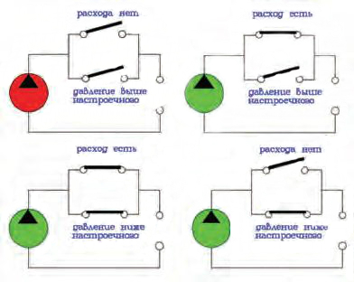 Когда при водопотреблении давление в сети опускается ниже настроечного, блок пускает насос, обеспечивая подачу воды пользователям. Значение давления включения можно задать самостоятельно, в диапазоне от 1,5 до 3,0 бара (заводская настройка – 1,5 бара). После прекращения разбора воды выключение насоса происходит с задержкой в 8 с, что исключает возникновение гидроудара. При отсутствии воды во всасывающей линии блок отключает насос с задержкой 10–15 с, защищая его от «сухого» хода.