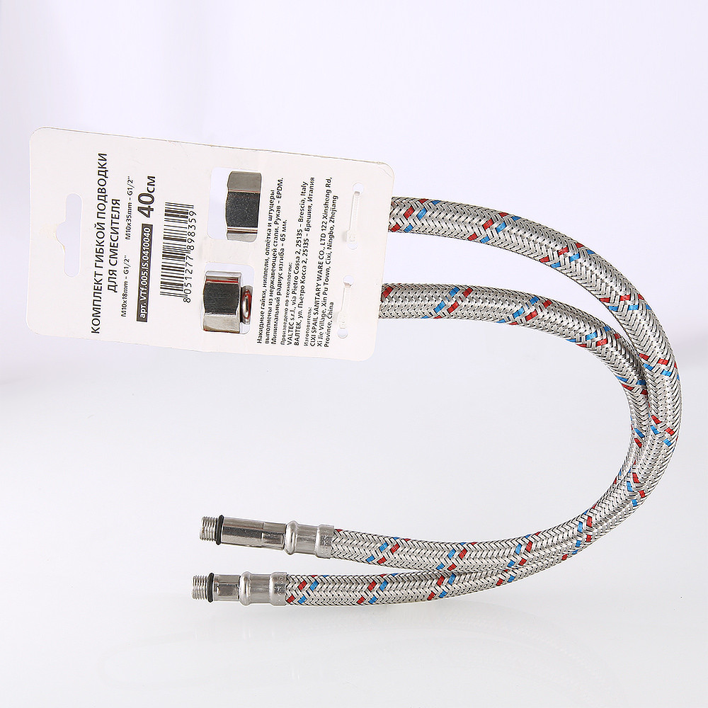 (VTf.005.IS) Комплект гибкой подводки для подключения смесителя объединяет в себе пару подводок гибких VALTEC c концевыми элементами гайка–штуцер, 1/2” х M10, длина штуцера – 18 и 35 мм (такое сочетание обеспечивает удобное подсоединение подводки).