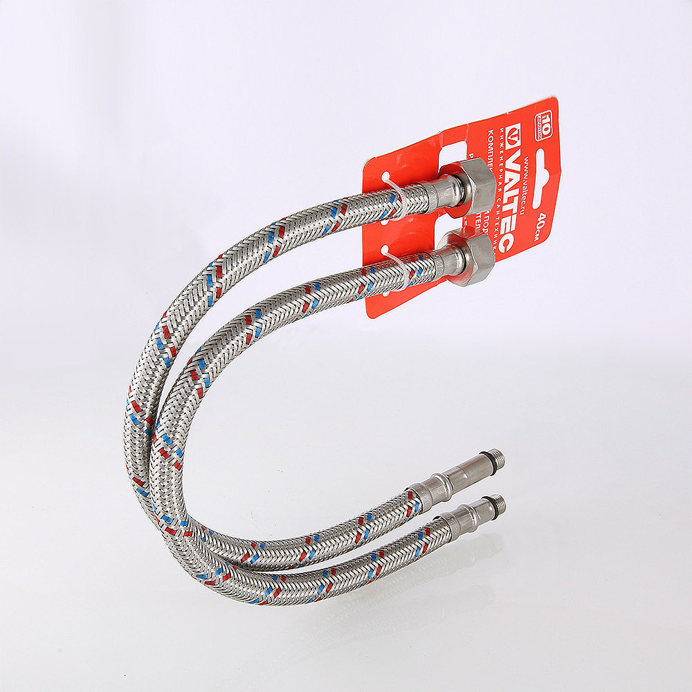 Подводки гибкие для воды VALTEC рассчитаны на эксплуатацию при рабочем давлении 10 бар (максимальное давление – 20 бар) и температуре от 1 до 95 °C (максимальная температура – 100 °C). Внутренний диаметр шланга – 8,5 ± 0,5 мм. Закладной ниппель, накидная гайка, пресс-гильзы и оплетка подводки изготовлены из нержавеющей стали AISI 304. Использование ниппеля из нержавеющей стали позволило исключить излом этого элемента, повысить надежность всего изделия.