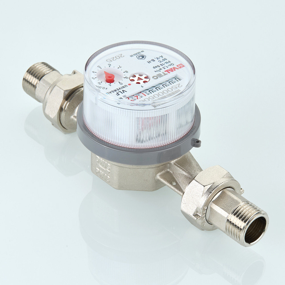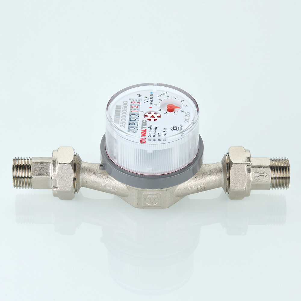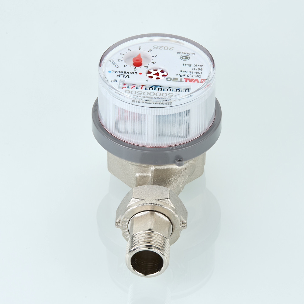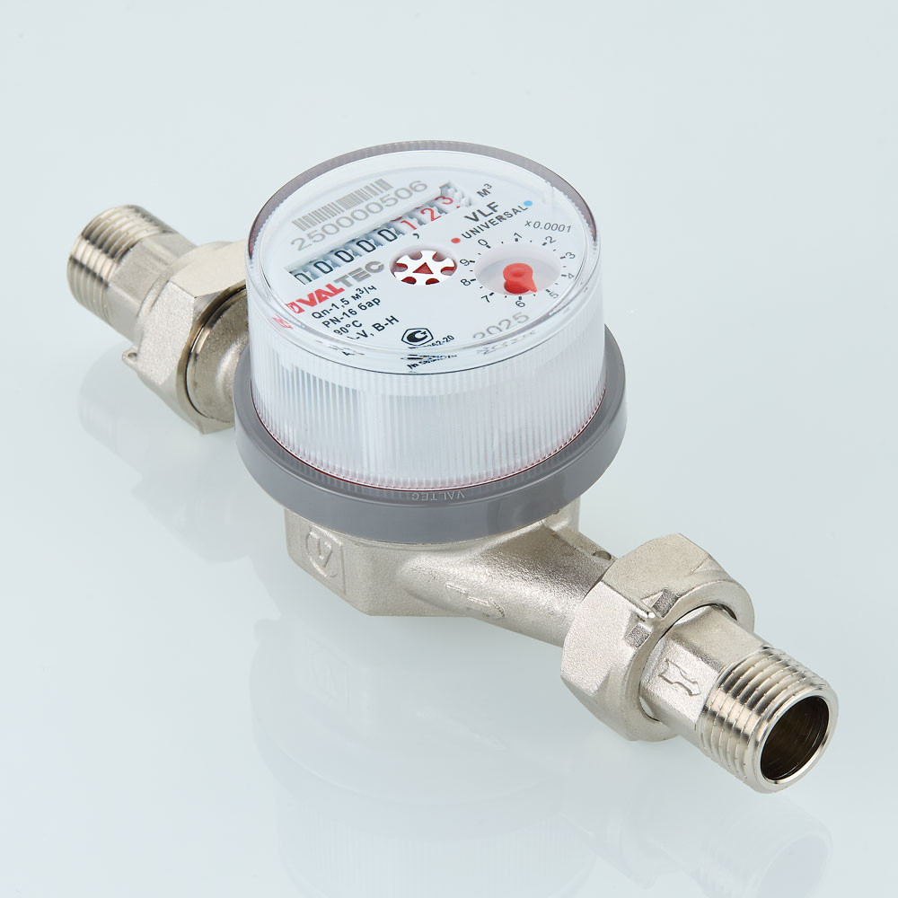 (VLF-15U) Водосчетчик универсальный – для измерения расхода холодной и горячей воды, главным образом – в квартирах. Условный диаметр модели – 1/2"; номинальный расход воды – 1,5 куб. м/ч. Длина прибора без сгонов – 110 мм. Резьба присоединительных патрубков – 3/4".