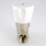 (VT.004.N) Проходной ручной регулирующий клапан с функцией предварительной настройки КРДП 11Б25бк. Конструкция клапана полностью исключает возможность вмешательства пользователя в монтажную настройку (она может производиться только на «сухом» стояке). Корпус и пробка клапана выполнены из латуни марки CW617N, никелированы, сальниковый узел – из тефлона. Кран ремонтопригоден. Максимальная рабочая температура теплоносителя – 150 °С, максимальное рабочее давление – 16 бар. Резьба присоединения – внутренняя/внутренняя.