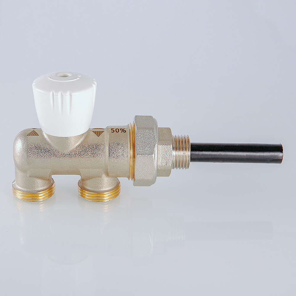Регулирование расхода теплоносителя через радиатор – ручным клапаном вертикальной компоновки. Клапан узла 100 % в полностью открытом состоянии направляет весь поток теплоносителя через отопительный прибор, в промежуточном положении часть потока направляется в байпас. Клапан узла 50 % даже в полностью открытом состоянии направляет часть теплоносителя в байпас, минуя радиатор.