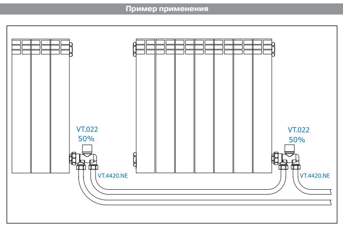 (VT.022.N) Предназначен для одноточечного подключения радиатора к системе водяного отопления. Циркуляция теплоносителя в отопительном приборе обеспечивается введением в нижний коллектор зонда, который «разносит» прямой и обратный потоки по длине радиатора. Узел выпускается в исполнении 100 % – для однотрубных систем с числом радиаторов не более 5 шт. на ветке, 50 % – для однотрубных систем с числом радиаторов свыше 5 шт. на ветке.