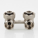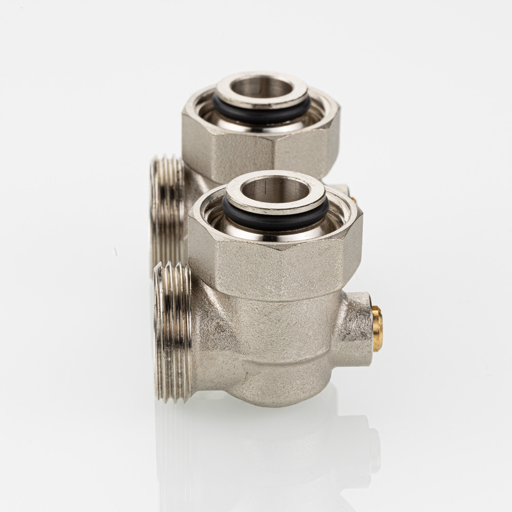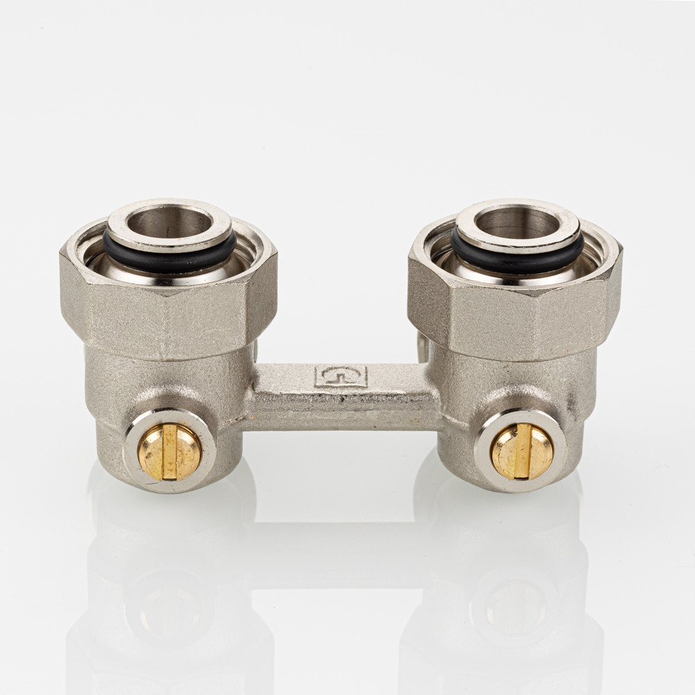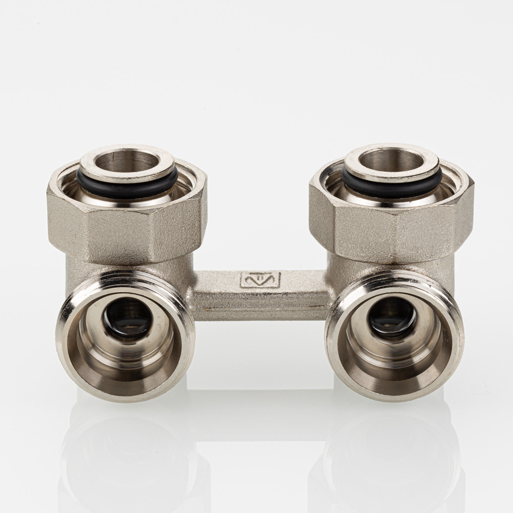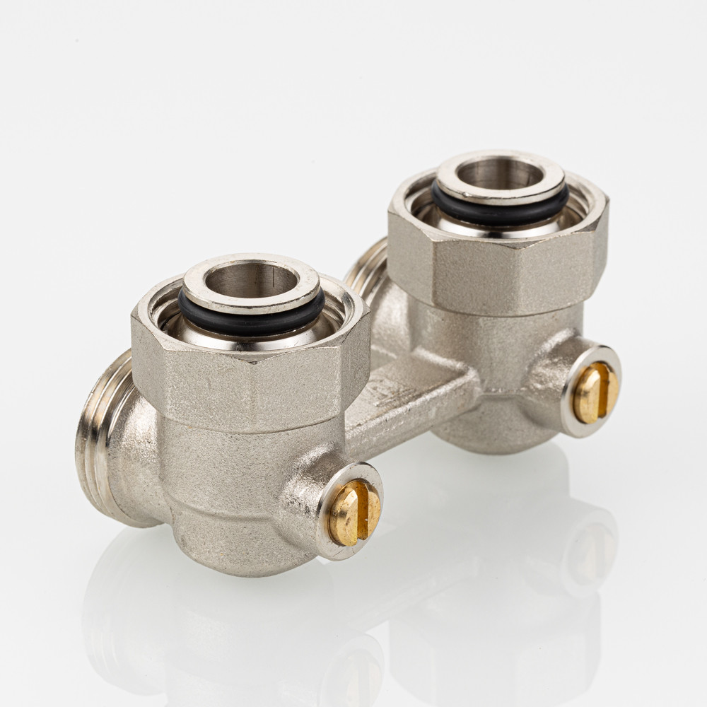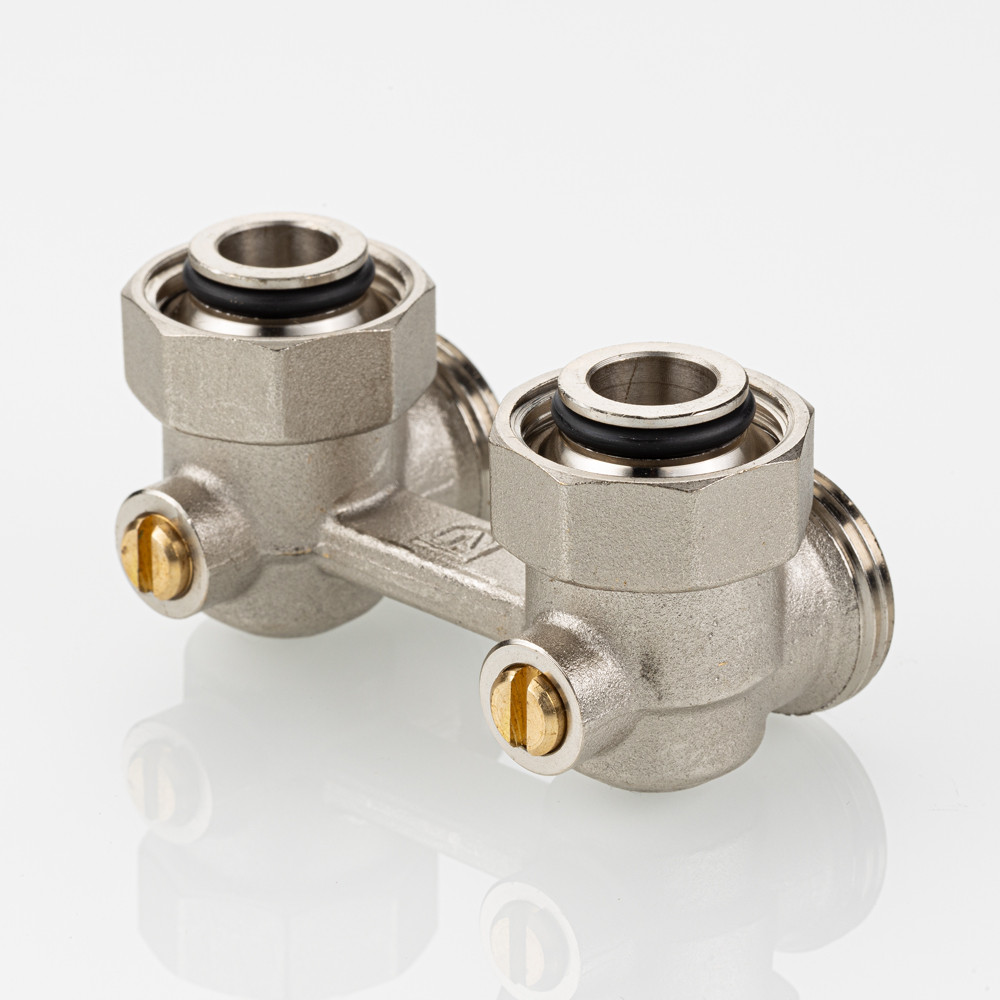 (VT.345.ANE) Узел нижнего подключения радиатора VT.345.ANE представляет собой латунный Н-образный клапан для нижнего подключения отопительных приборов с межосевым расстоянием присоединительных патрубков 50 мм (стального панельного радиатора или стального конвектора).