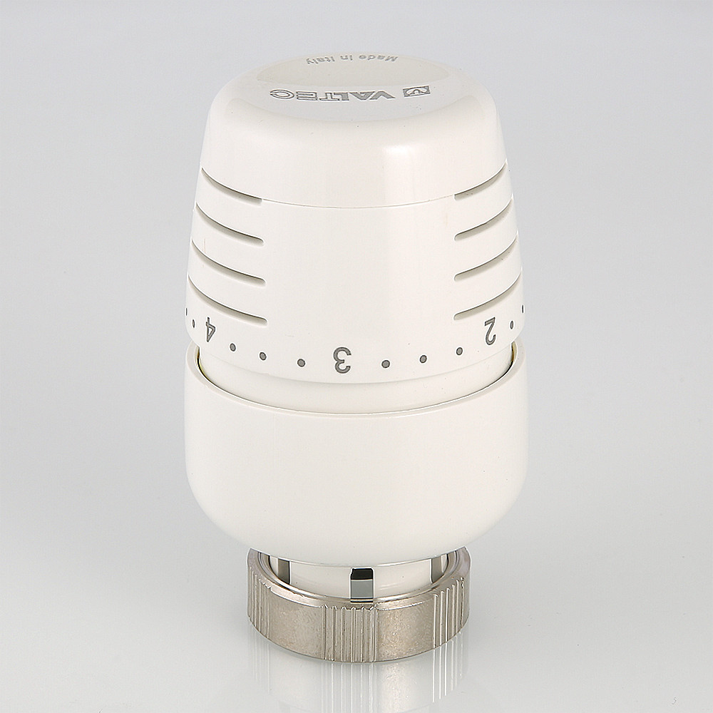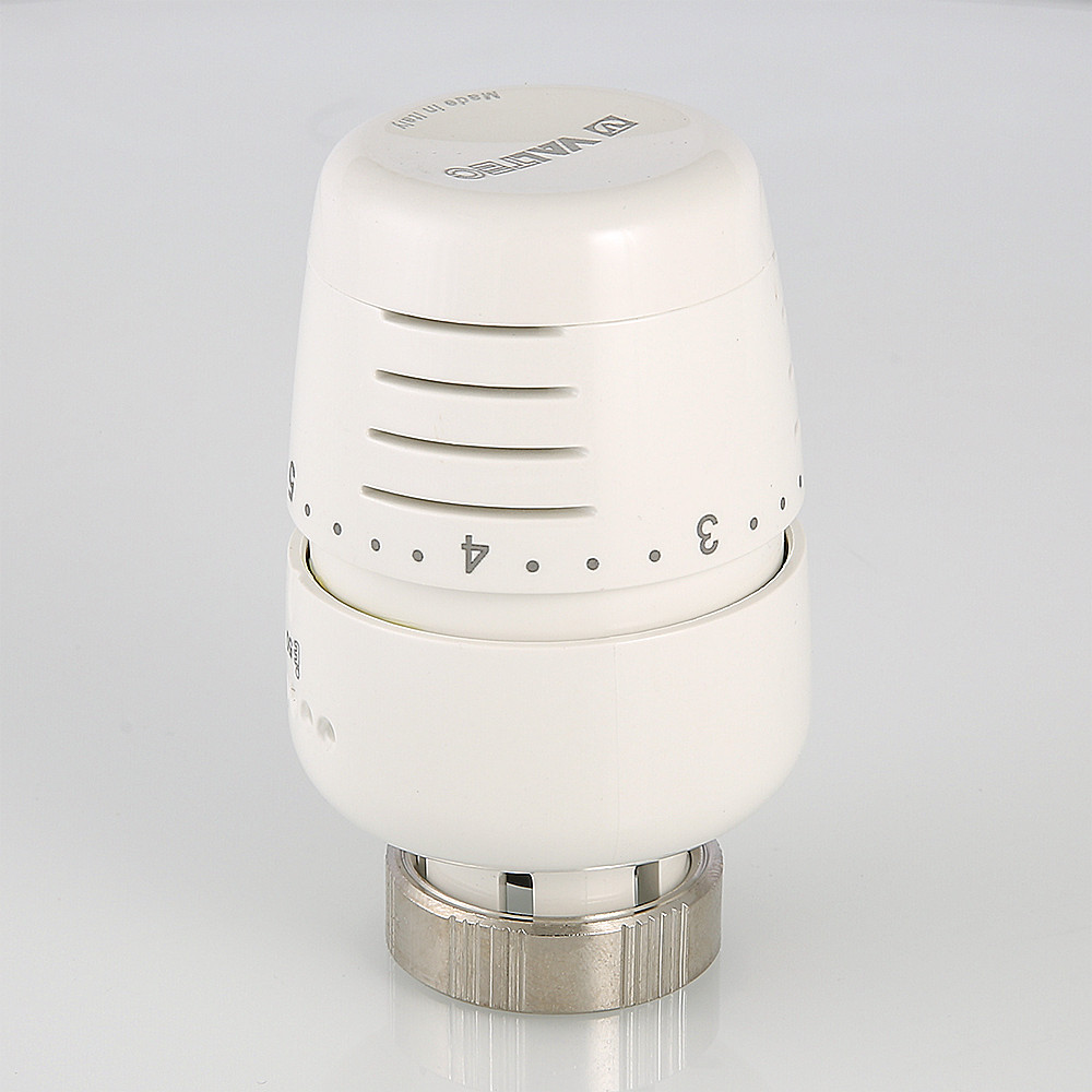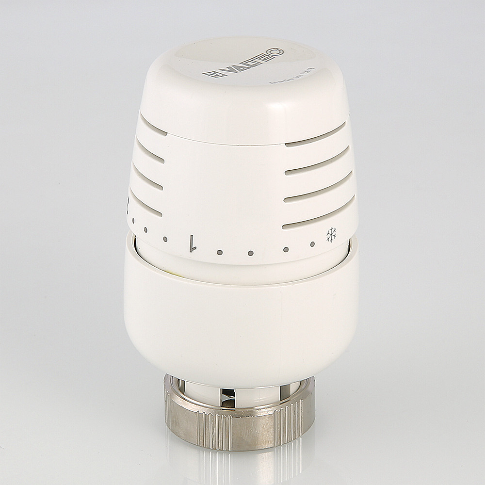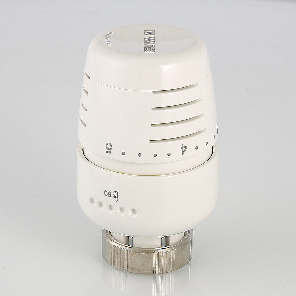 (VT.5000.0) Термостатическая головка устанавливается на термостатический радиаторный клапан и предназначена для автоматического регулирования расхода теплоносителя через отопительный прибор в зависимости от температуры воздуха в помещении. Использование регулирующих клапанов VALTEC c термостатической головкой позволяет автоматически поддерживать заданную температуру в помещении с точностью до 1 °С. Наполнитель сильфона (термочувствительного элемента) – этилацетат. Диапазон регулирования температуры воздуха – от 6,5 до 28 °С. Присоединение головки к клапану осуществляется с помощью накидной гайки с резьбой М30 x 1,5.