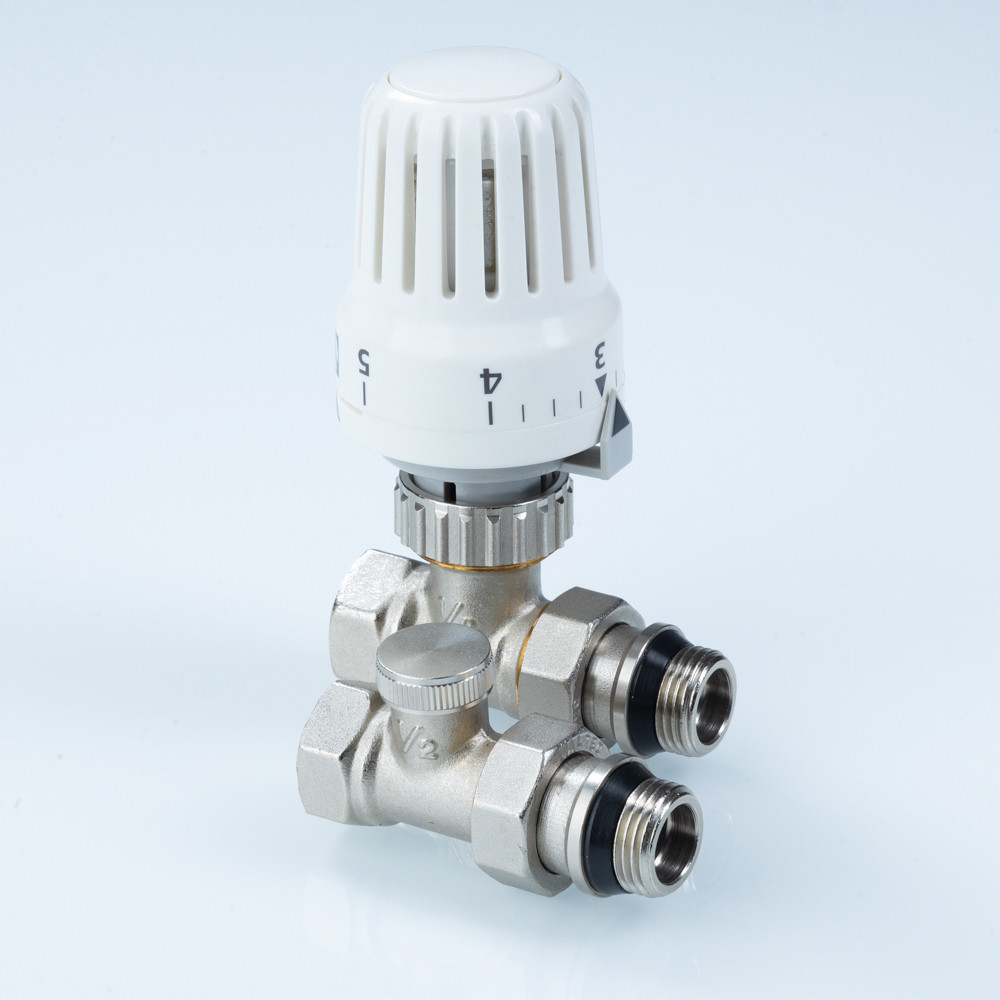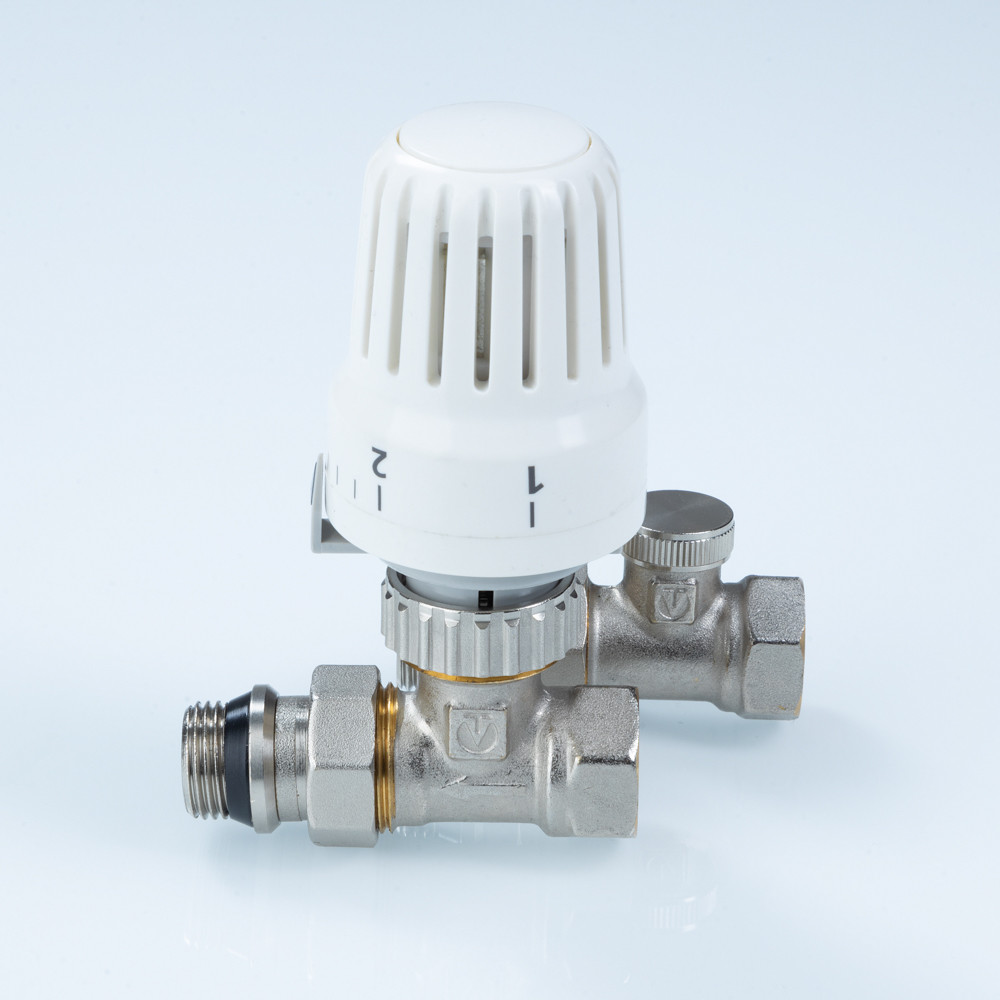 (VT.046.N) Комплект терморегулирующего оборудования VT.046 включает в себя прямые термостатический и запорно-регулировочный (настроечный) радиаторные клапаны, а также термостатическую головку. Набор предназначен для бокового подключения прибора водяного отопления, автоматического регулирования расхода теплоносителя через него в зависимости от температуры воздуха в помещении, гидравлической балансировки системы отопления. Клапаны выполнены из качественной сантехнической латуни с гальваническим покрытием и оснащены самоуплотняющимися полусгонами. Колпачок ручной регулировки на термостатическом клапане состоит из двух частей – неподвижной нижней и вращающейся верхней. Это позволяет многократно производить монтажную настройку клапана в условиях строительства (до установки термостатической головки), не переживая за целостность резьбы на пластиковом колпачке. Комплект помещен в пылевлагозащитную упаковку (блистер). Стоимость данного комплекта меньше, чем при раздельной покупке входящих в него элементов.