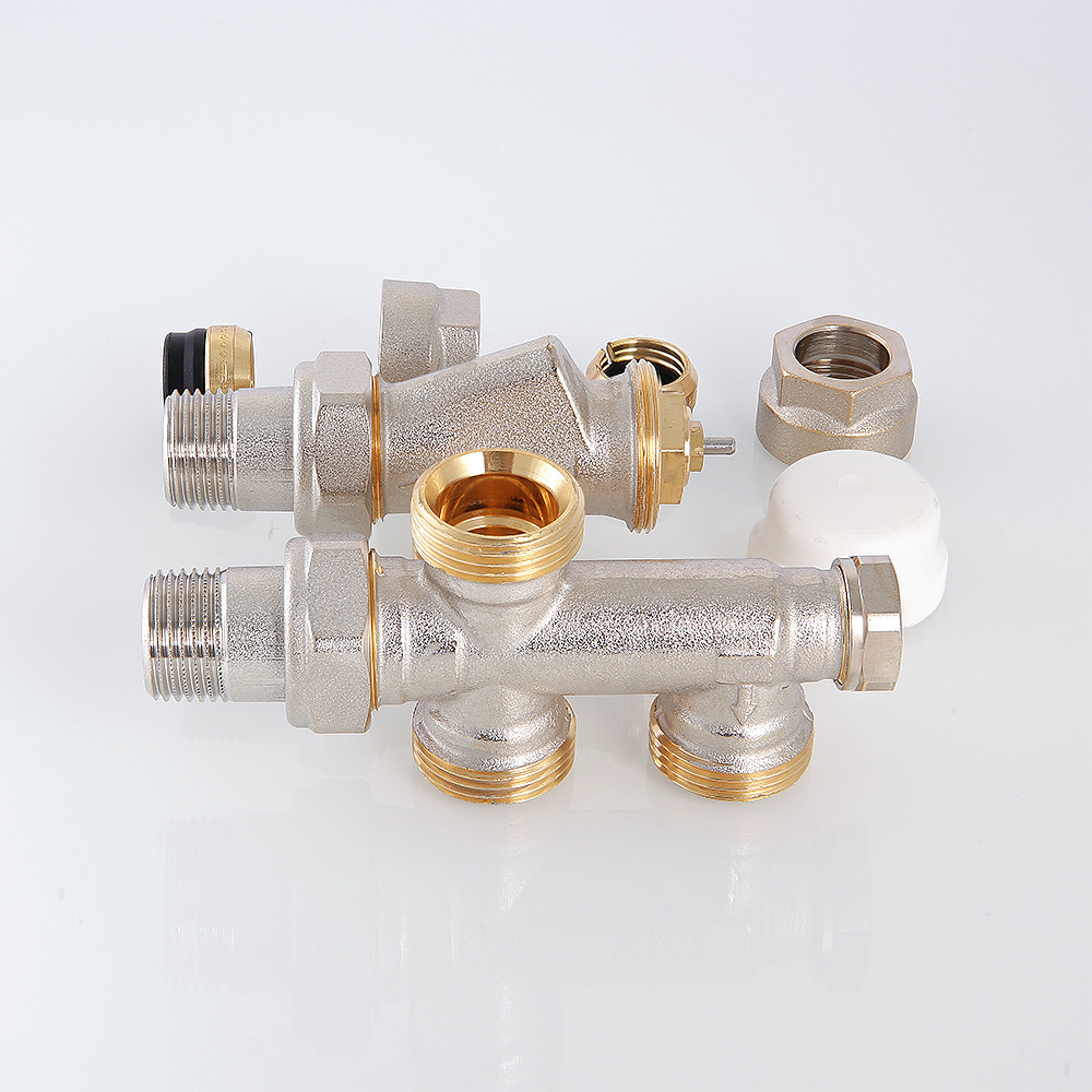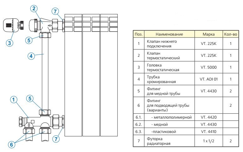 (VT.225K.N) Предназначен для организации бокового подключения радиатора при горизонтальной (нижней) трубной разводке. Включает в себя четырехходовой клапан для нижнего подключения трубопроводов (блок нижнего подключения) VT.225, который снабжен встроенным настроечным клапаном, позволяющим осуществить гидравлическую балансировку системы. Выпускается в исполнении для одно- (50 %) и двухтрубных (100 %) систем. В первом случае клапан имеет байпас, по которому часть теплоносителя возвращается в систему, минуя отопительный прибор.
