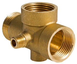 (600) Латунный пятиходовой резьбовой фитинг для присоединения к напорной линии от насоса водоснабжения мембранного бака (гидроаккумулятора), манометра и реле давления. Производитель – ENOLGAS Bonomi (Италия).