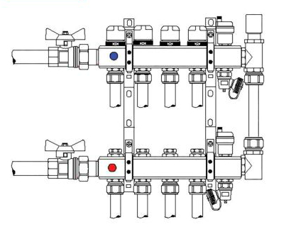 (VT.0666.0) Коллекторный байпас «замыкает» поток теплоносителя напольного, радиаторного отопления, другой климатической системы, направляя жидкость к обратному коллектору, когда расход через греющие петли становится ниже заданного значения. Это защищает циркуляционный насос от работы «на закрытую задвижку», сохраняет гидравлические характеристики системы, циркуляцию при перекрытии коллекторных петель. Действие байпаса основано на применении перепускного клапана.