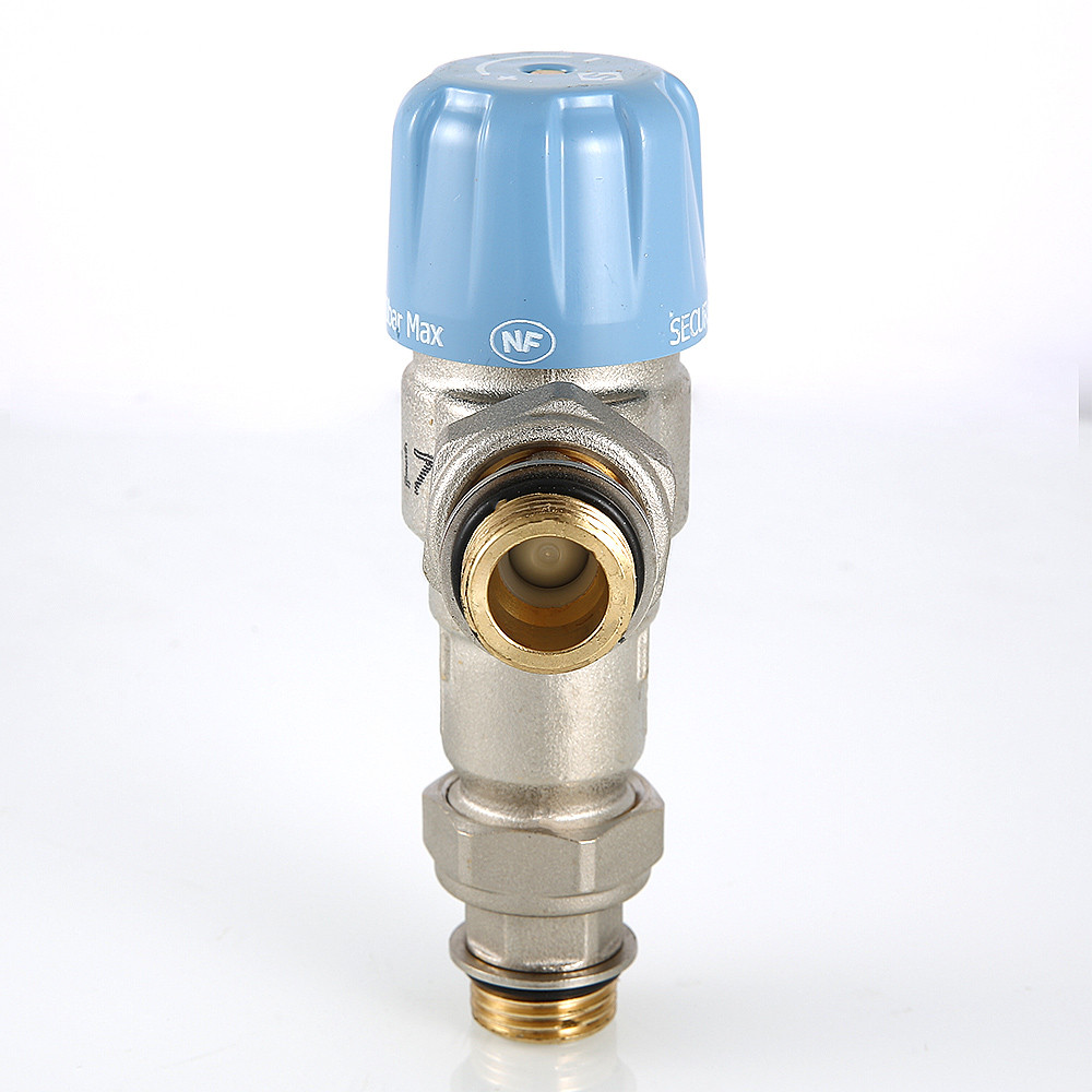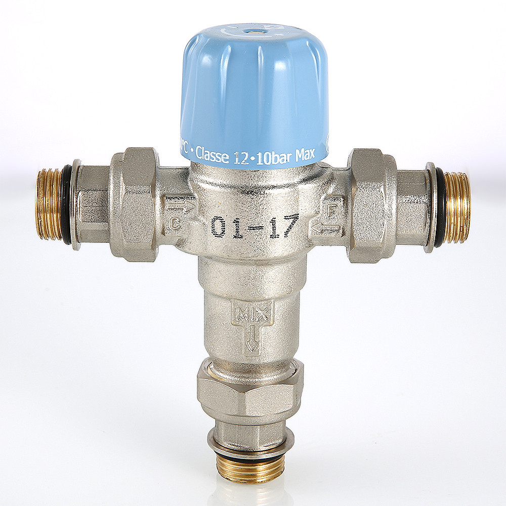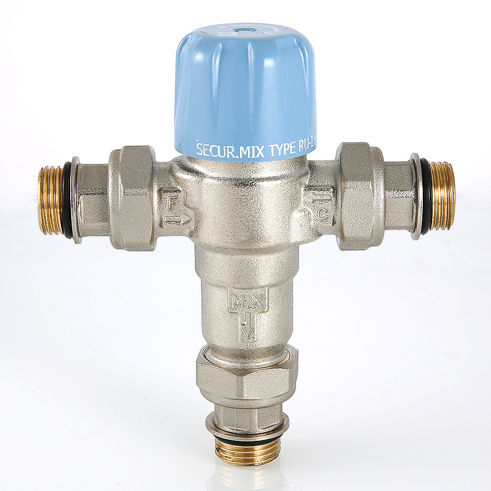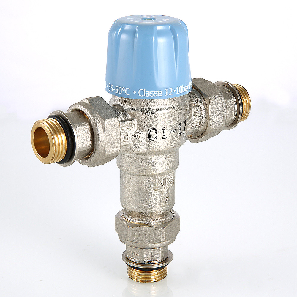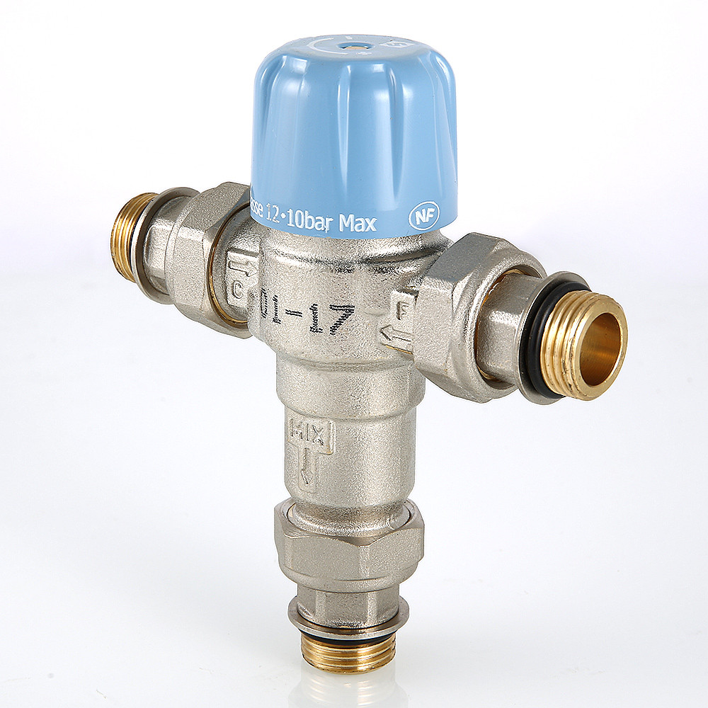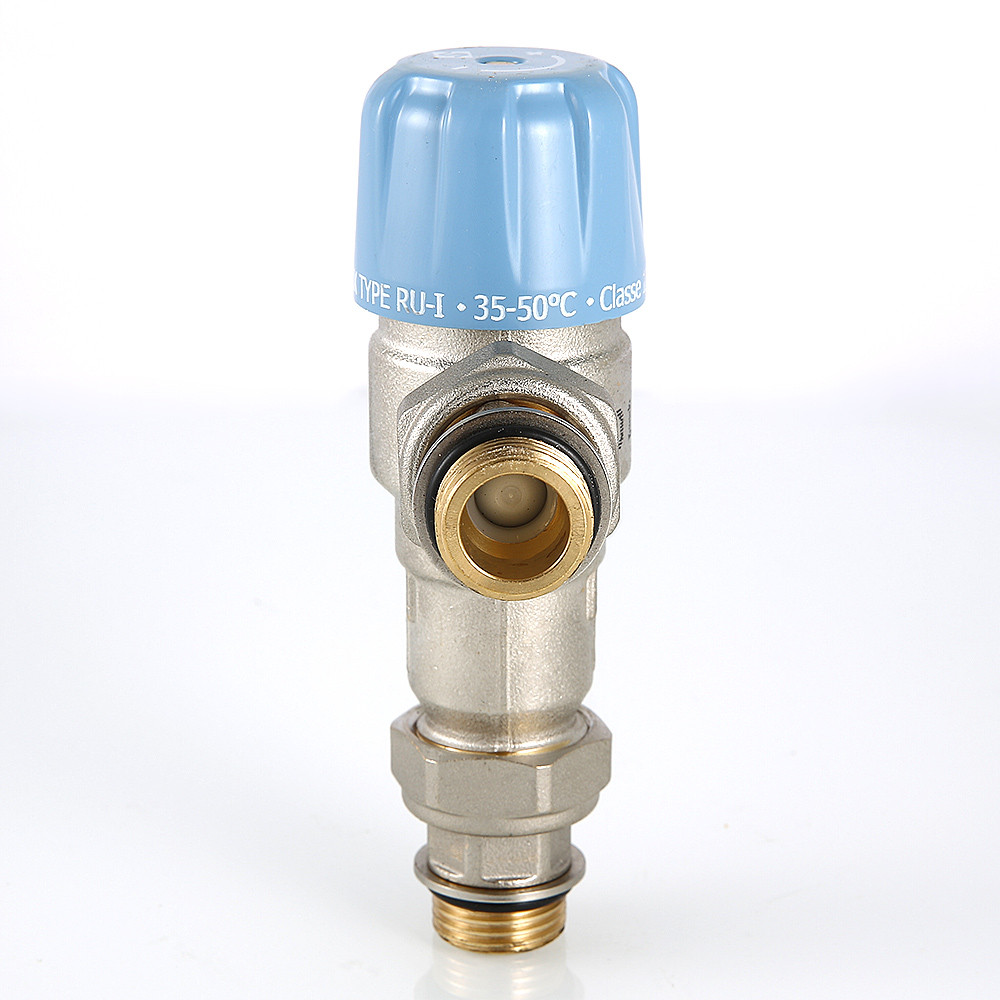 (VT.MT10RU) Трехходовой термостатический смесительный клапан с изменяемой в диапазоне от 30 до 50 °C настройкой. Предназначен для автоматического поддержания заданной температуры в системе горячего водоснабжения. Ее превышение исключается даже при полном отключении холодной воды, что позволяет использовать смеситель в школах, детских садах, других общественных зданиях. Термостат оперативно реагирует на изменение температуры и давления входящих потоков. Клапан выполнен из качественной латуни, никелирован. Встроенный термочувствительный элемент – твердотельный (армопарафин). Патрубки клапана соединены накидными гайками с полусгонами. Резьба присоединений – внешняя. Входы смесителя комплектуются обратными клапанами из нейлона. Максимальная температура на входе горячей воды – 90 °C, допустимое рабочее давление входных потоков – до 10 бар.