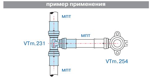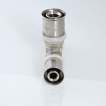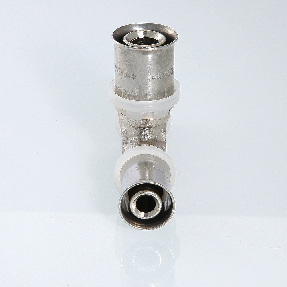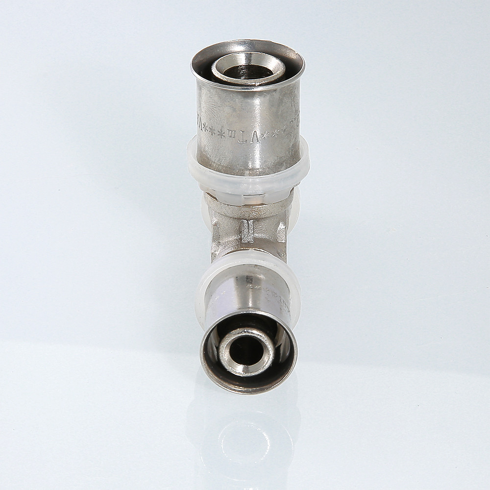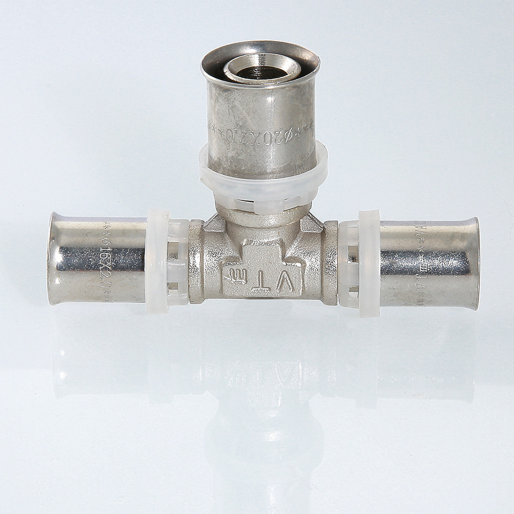 (VTm.231.N) Пресс-фитинг – тройник предназначен для соединения трех труб – металлопластиковых, из сшитого полиэтилена или полиэтилена повышенной термостойкости. Корпус выполнен из сантехнической латуни марки CW617N, уплотнительные кольца штуцеров – из EPDM плотностью 1,22 г/см3, пресс-гильзы – из нержавеющей стали. Нейлоновая обойма выполняет функции фиксатора гильзы, направляющей для пресс-насадок и диэлектрической прокладки, прерывающей контакт между алюминием трубы и латунью корпуса. Конструкция пресс-фитингов VALTEC обеспечивает повышенную пропускную способность, надежность соединений, прочность и термостойкость. Монтаж фитинга производится пресс-инструментом с насадкой «ТН». Типоряд содержит равнопроходные и переходные пресс-тройники.