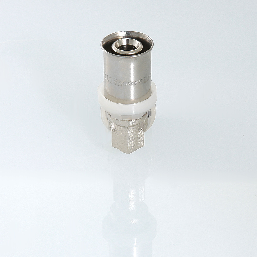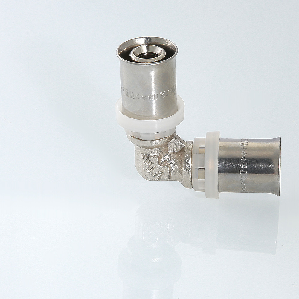 (VTm.251.N) Пресс-фитинг – угольник, обеспечивающий соединение труб (металлопластиковых или из сшитого полиэтилена) под углом 90 градусов. Особенности конструкции изделия, используемые материалы обусловили надежность соединений, повышенную пропускную способность, температурную стойкость, механическую прочность. При изготовлении пресс-угольника используются высококачественные материалы: сантехническая латуни CW617N с никелевым покрытием (корпус), нержавеющая сталь (гильза), EPDM (уплотнительные кольца, 2 шт. для каждого штуцера). Фиксатор, одновременно играющий роль диэлектрической прокладки, делается из нейлона. Монтаж соединителя выполняется пресс-инструментом с насадкой «ТН».