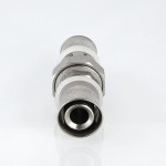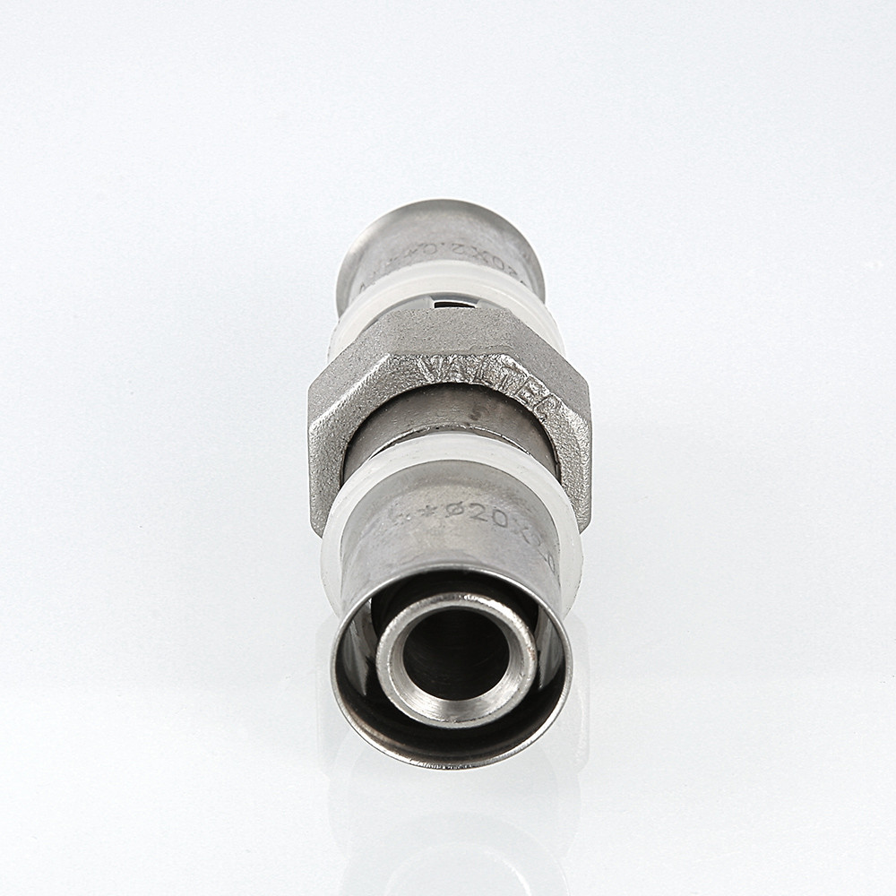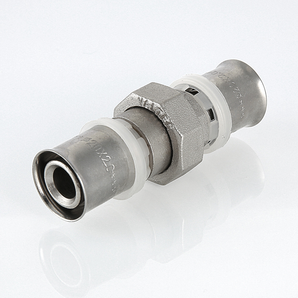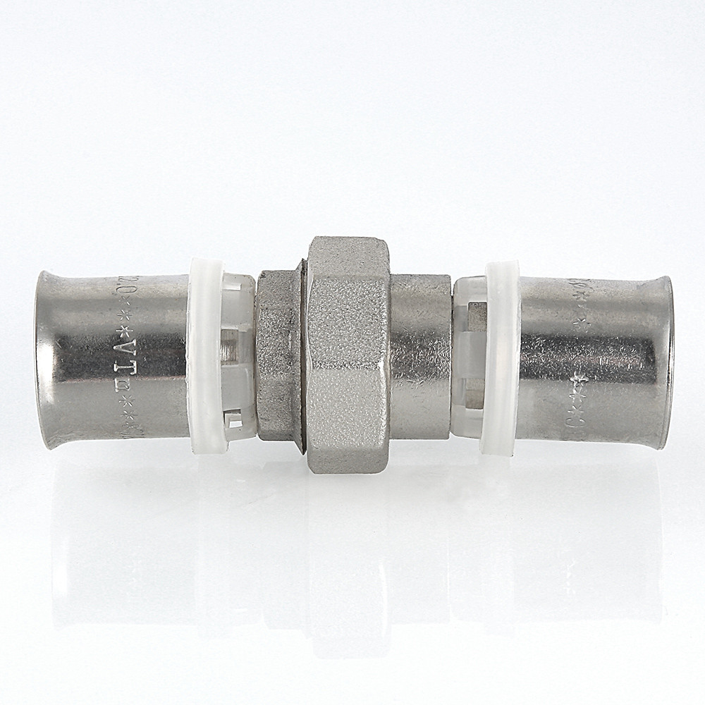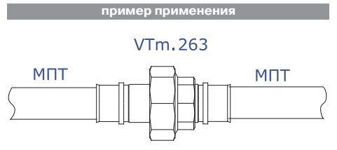 (VTm.263.N) Прямой равнопроходной пресс-фитинг для создания разъемного соединения на трубопроводе из металлополимерных труб (металлопластиковых труб) или труб из сшитого полиэтилена. Состоит из двух пресс-деталей: с переходом на наружную резьбу и с накидной гайкой.