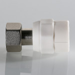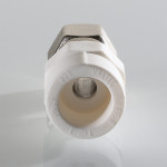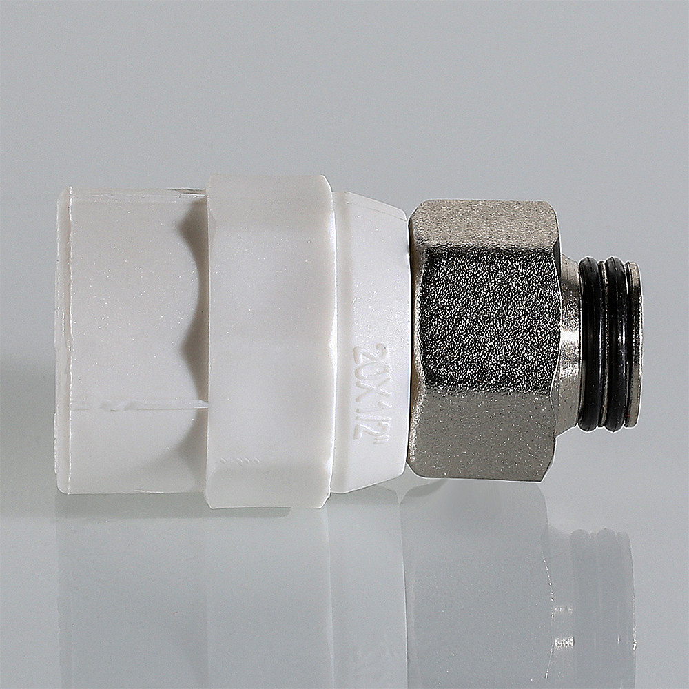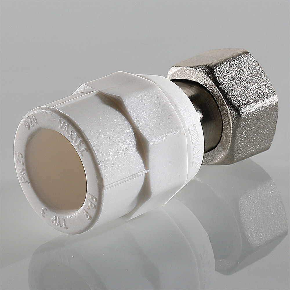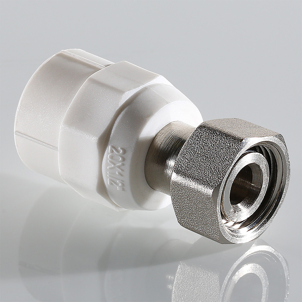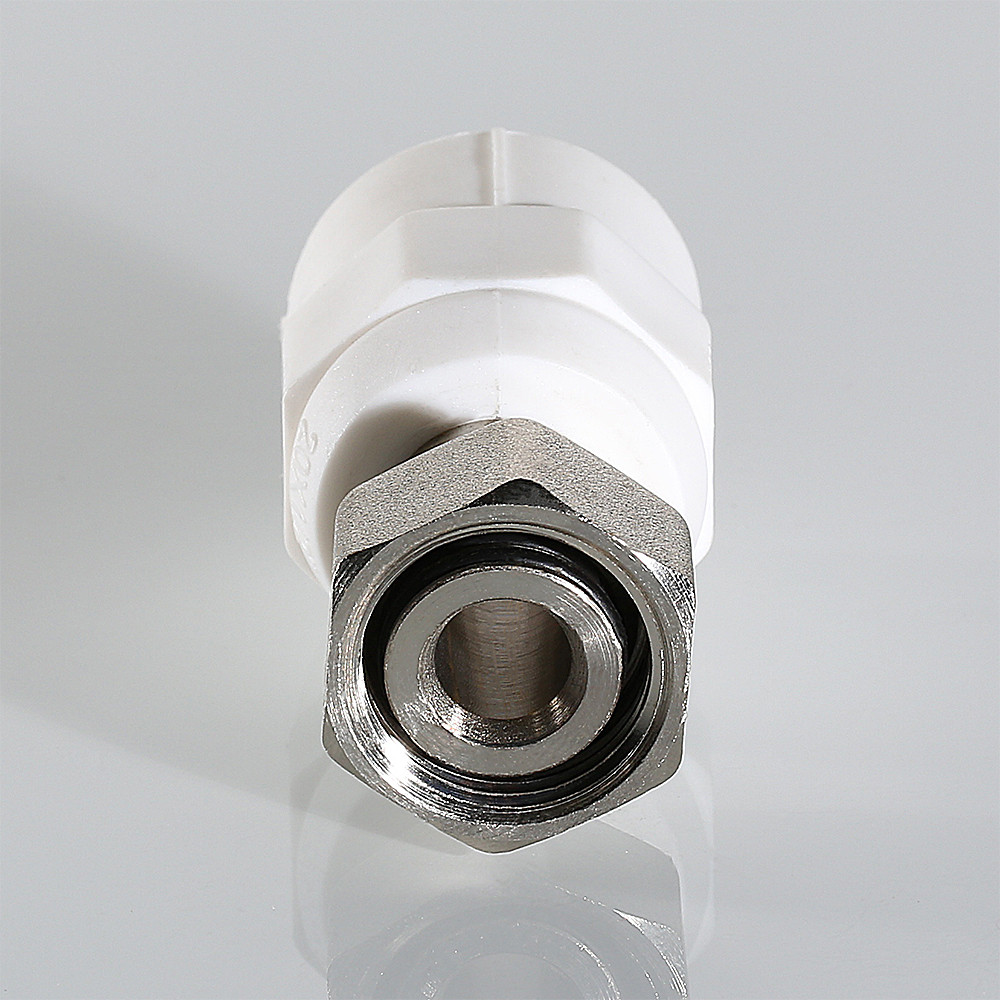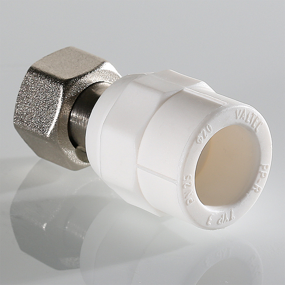 Корпус фитинга изготовлен из полипропилена, накидная гайка и закладная деталь – из латуни CW617N с нанесением никелевого гальванопокрытия. Никелирование закладной детали исключает охрупчивание полипропилена при контакте с содержащейся в латуни медью. Конструкция соединения латунной детали с полипропиленовым корпусом запатентована VALTEC. Узел дополнительно герметизирован EPDM-кольцом. Наружный диаметр присоединяемой трубы – 20 мм.