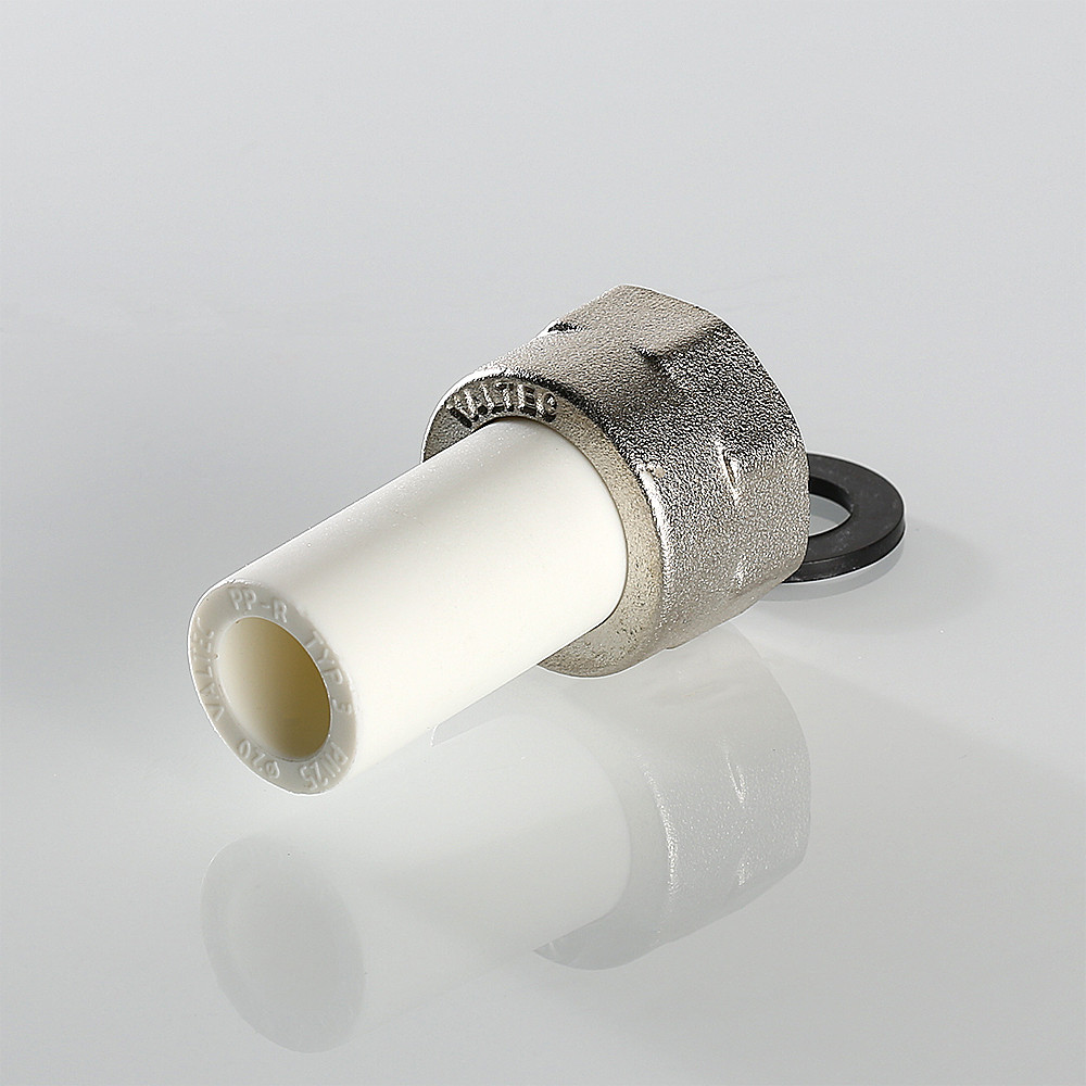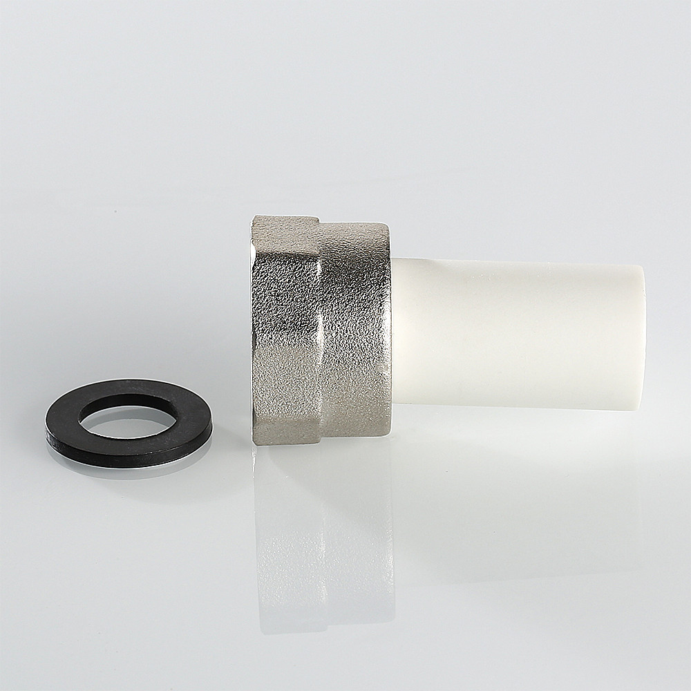 (VTp.722.0) Штуцер полипропиленовый с накидной гайкой. Позволяет подсоединить к трубопроводу из полипропилена элемент системы с резьбовым подключением. Накидная гайка выполнена из латуни, никелирована. Резьба – внутренняя.
