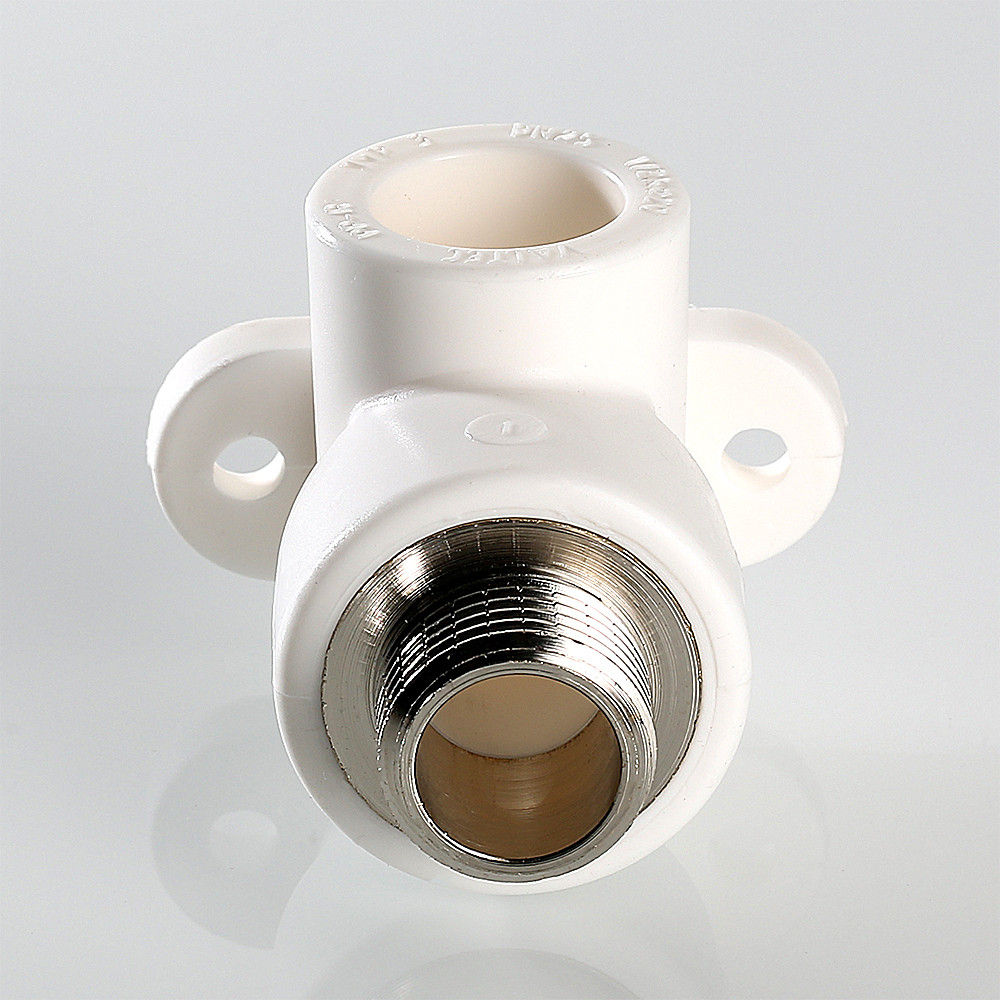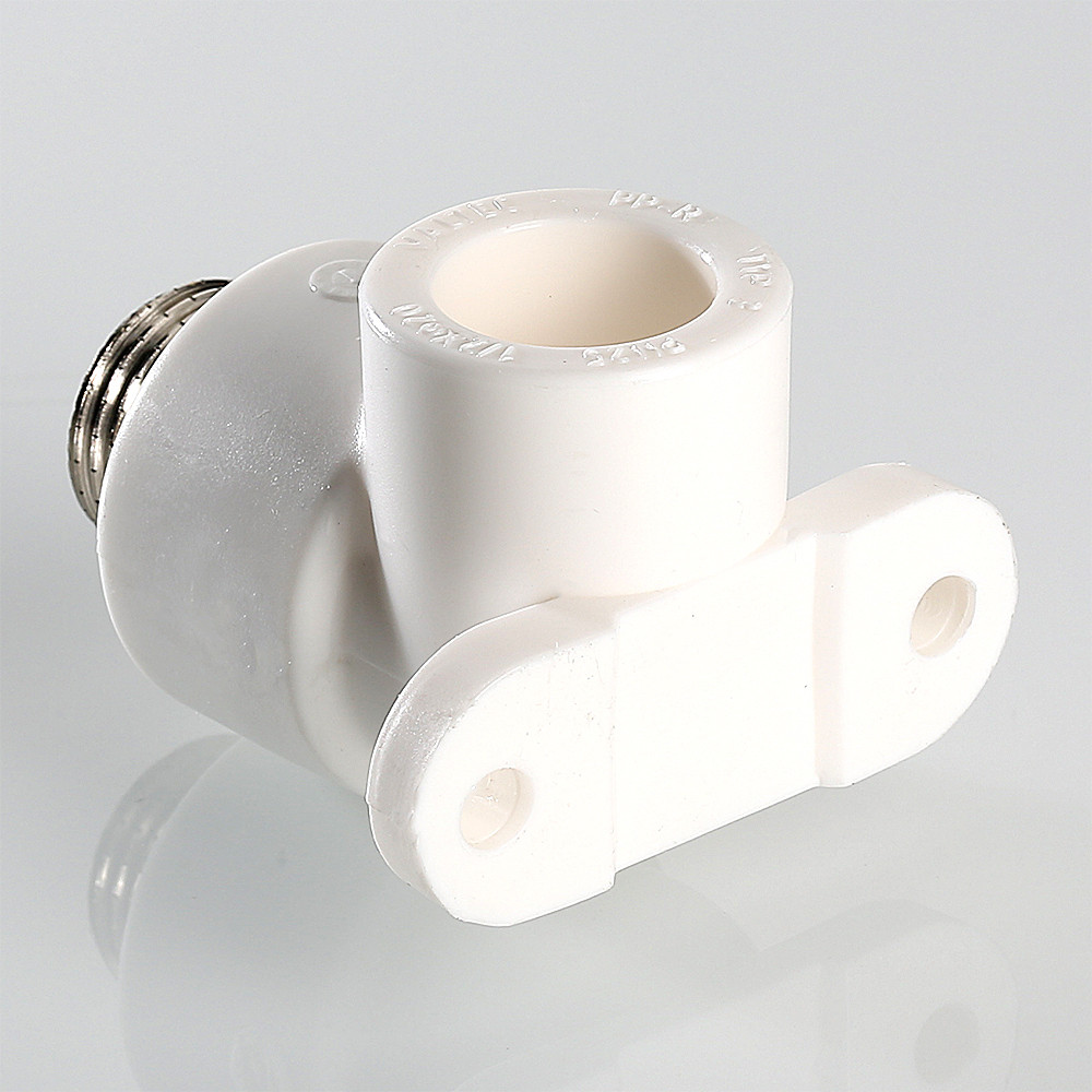 (VTp.755.0) Комбинированный угловой фитинг с креплением (полипропиленовая водорозетка), предназначенный для подсоединения к полипропиленовому трубопроводу сантехнического смесителя или другого компонента инженерной системы с резьбовым подключением. Резьба фитинга – наружная трубная по ГОСТу 6357, 1/2".