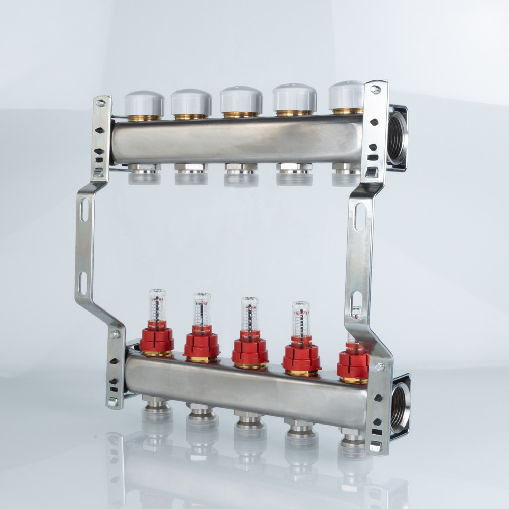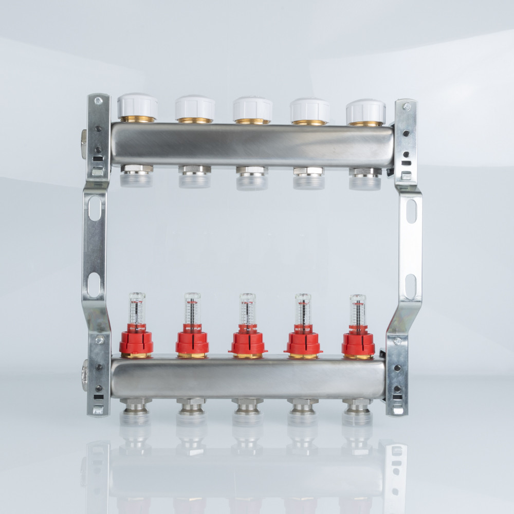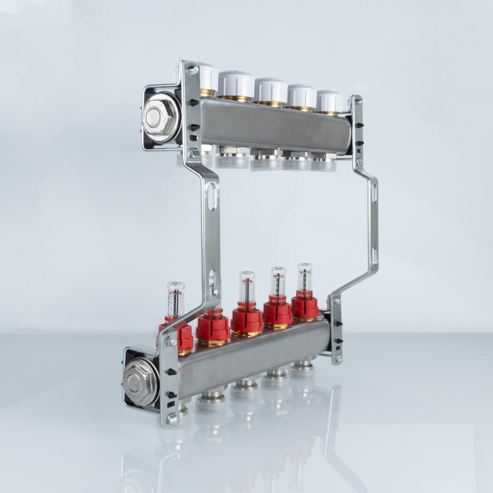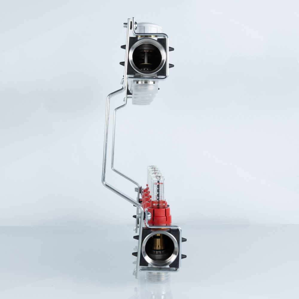 Коллекторный блок объединяет в себе подающий и обратный коллекторы из нержавеющей стали AISI 304, ручные настроечные клапаны с расходомерами (ротаметрами), регулирующие клапаны (с возможностью установки электротермического сервопривода), пробки коллекторов и крепежные кронштейны из оцинкованной стали. В состав блока не входят элементы сервисной группы.