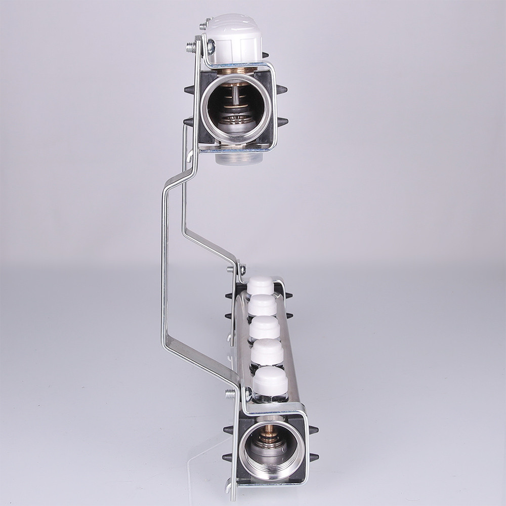 Коллекторный блок объединяет в себе подающий и обратный коллекторы из нержавеющей стали AISI 304, ручные балансировочные клапаны, регулирующие клапаны (с возможностью установки электротермического сервопривода), пробки коллекторов и крепежные кронштейны из оцинкованной стали. В состав блока не входят элементы сервисной группы.