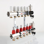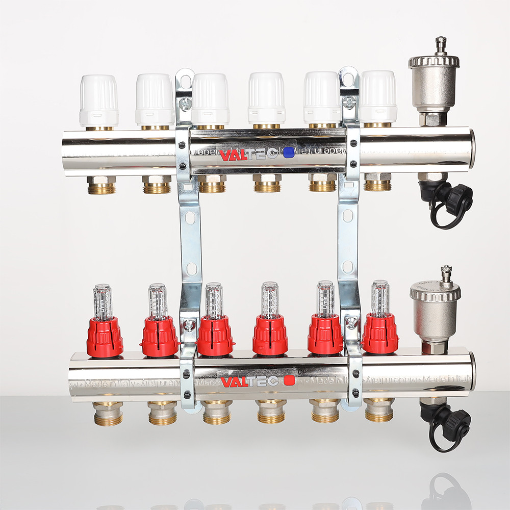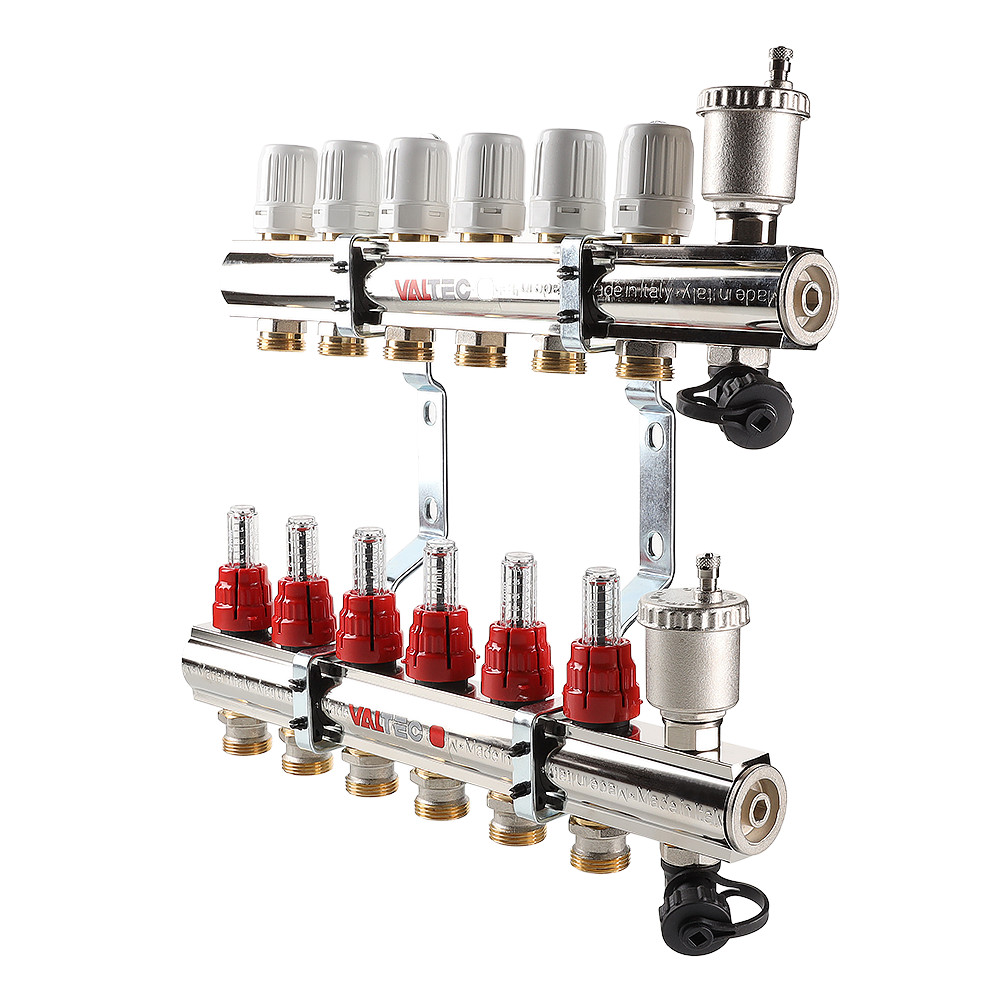 (VTc.596.EMNX) Коллекторный блок со встроенными расходомерами выпускается для распределения теплоносителя к потребителям в системах водяного отопления – радиаторам, конвекторам, петлям теплого пола, обогрева открытых площадок.