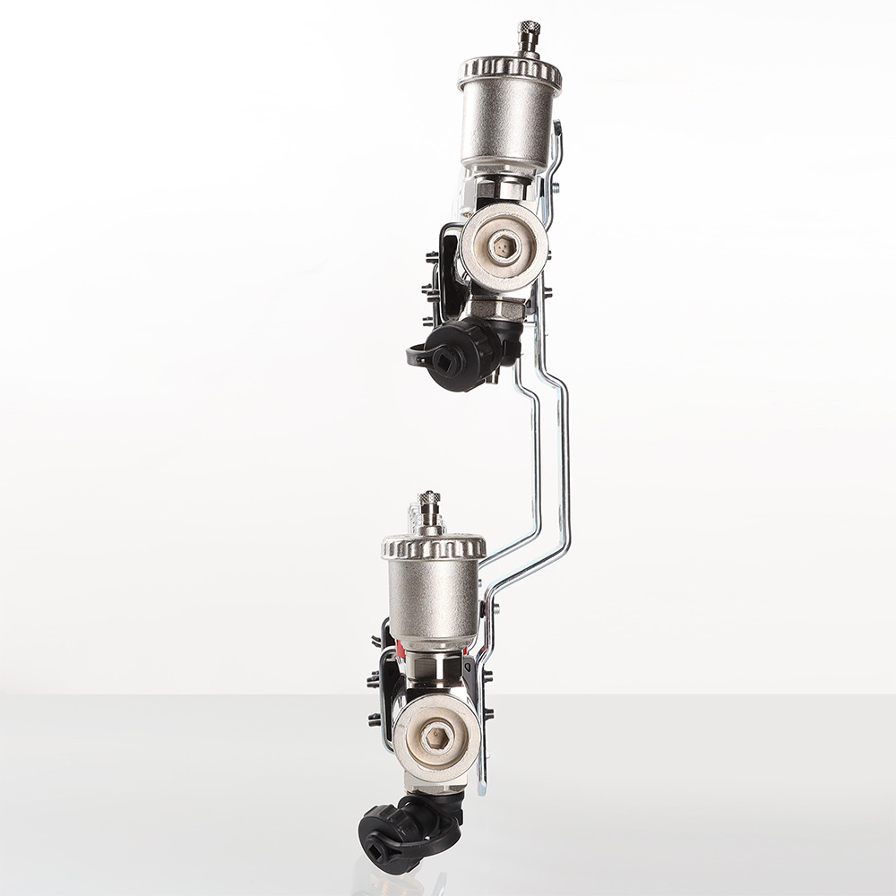 Присоединение трубопроводов к выходам – по стандарту «евроконус». Блок укомплектован также автоматическими воздухоотводчиками с отсекающими клапанами, дренажными кранами, сдвоенными крепежными кронштейнами.