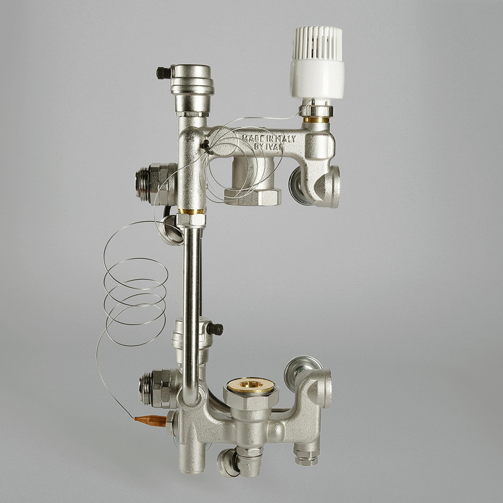 Регулирование осуществляется двухходовым клапаном, установленным в подающем коллекторе и управляемым термостатической головкой с выносным погружным датчиком, который размещен на выходе смесительного узла. При использовании контроллера отопления функция управления клапаном передается ему.