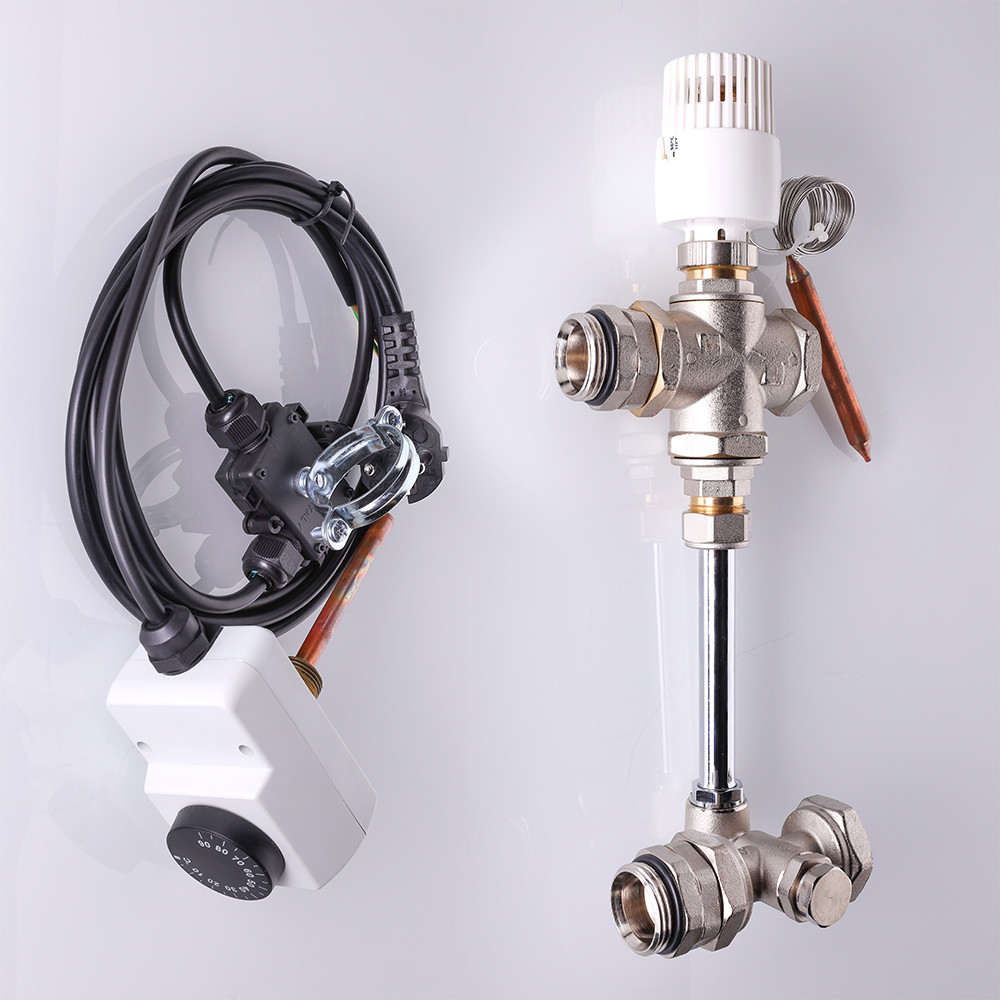 (VT.DUAL.0) Узел VALTEC DUALMIX состоит двух модулей – насосного и термостатического, между которыми монтируется коллекторный блок вторичного контура. Для смешения горячего теплоносителя с «обраткой» используется трехходовой клапан, управляемый термостатической головкой с выносным погружным датчиком. (При использовании контроллера отопления функция управления смесительным клапаном передается ему.) Другие основные элементы узла: перепускной байпас; балансировочный клапан; встроенные шаровые краны для отключения циркуляционного насоса; ручной воздухоотводчик; погружной термометр. Узел рассчитан на применение в системах отопления c водяным теплым полом при рабочем давлении до 10 бар и температуре теплоносителя в первичном контуре до 120 °С. Монтажная длина насоса (он приобретается отдельно) – 130 мм.