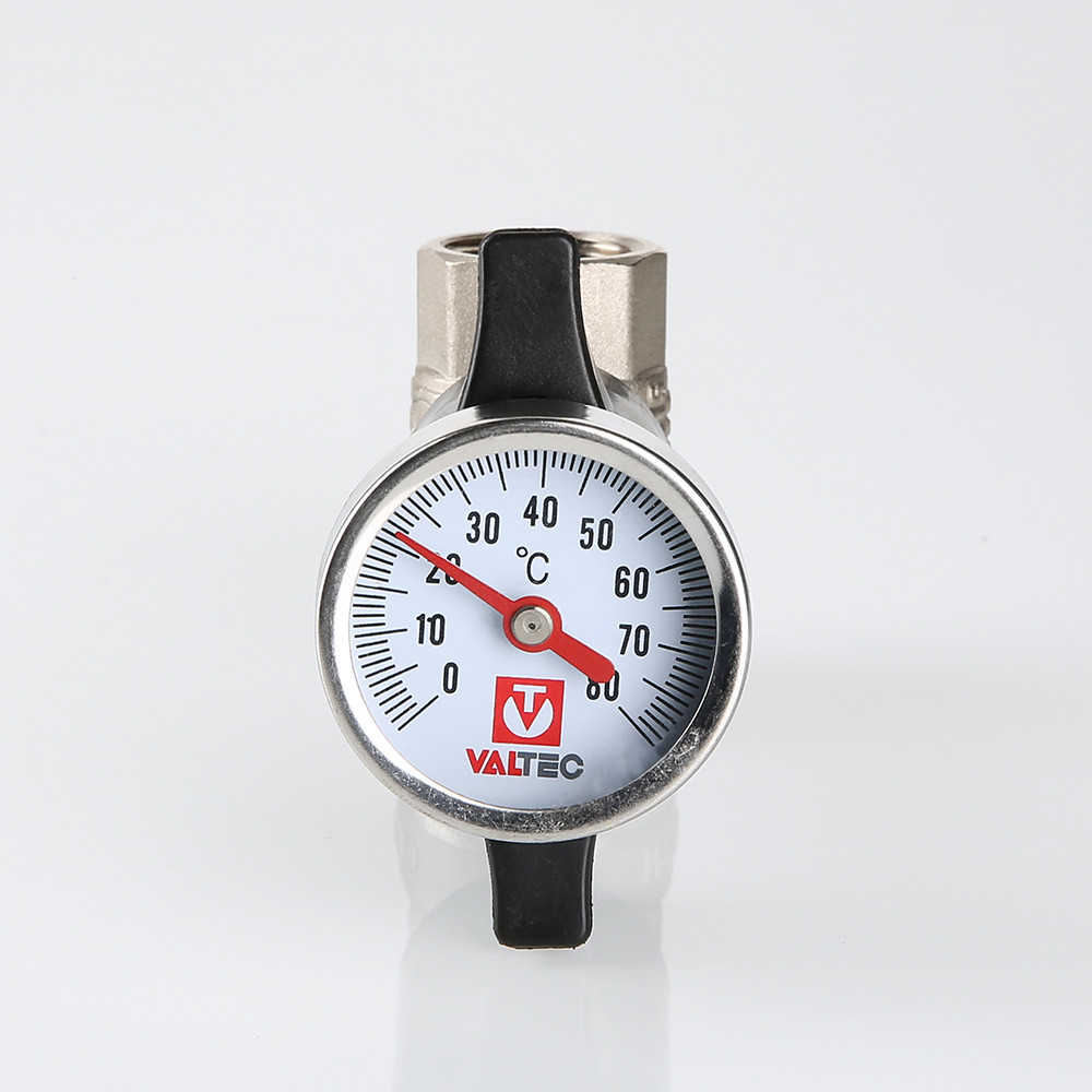 (VT.808.N) Термометр, встроенный в рукоятку управления шарового крана VALTEC BASE VT.808, обеспечивает визуальный контроль температуры рабочей среды в тепловых пунктах, узлах ввода горячей воды, трубопроводах обвязки бойлера и других точках инженерных систем. Термометр соединен с шаровым затвором гильзой из медного сплава, что позволяет измерять температуру с минимальной погрешностью. При необходимости прибор легко извлекается из рукоятки, а его гнездо закрывается заглушкой из ABS-пластика. Из этого же материала выполнена и сама рукоятка крана. Диаметр шкалы термометра – 42 мм, диапазон измерений – 0–80 °С. Резьба присоединения шарового крана с термометром VT.808 – внутренняя.