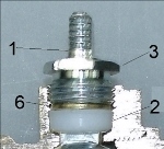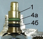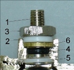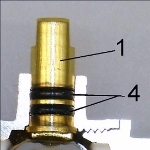 | Шток 1 вставлен изнутри. Два сальниковых кольца: нижнее 4б – из FPM и верхнее 4а из NBR | Узел неремонтопригоден. Температурная стойкость крана ниже, чем у кранов с тефлоновыми сальниками. Течь по штоку требует замены всего крана. Шток ослаблен кольцевыми проточками |