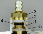 | 4 | | Шток 1 вставлен изнутри. В роли сальниковой выступает обычная гайка 3 с внутренней резьбой. Растяжка штока потребовала установки антифрикционного элемента 5. Уплотнение выполнено из тефлонового сальника 2 и резинового кольца 4 | Узел условно ремонтопригоден, т.к. заменить кольцо 4 нельзя. Малая высота сальника 2 не позволяет ему полноценно выполнять функции герметизации. Шток 1 имеет начальные напряжения от растяжки и ослаблен кольцевой проточкой |