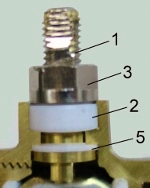 | 3 | | Шток 1 вставлен изнутри. Сальниковая гайка 3 имеет внутреннюю резьбу, что потребовало установки антифрикционного элемента 5. Уплотнение выполнено из тефлонового сальника 2 и резинового кольца 4 | Узел условно ремонтопригоден, т.к. заменить кольцо 4 нельзя. Малая высота сальника 2 не позволяет ему полноценно выполнять функции герметизации. Шток 1 имеет начальные напряжения от растяжки и ослаблен кольцевой проточкой |