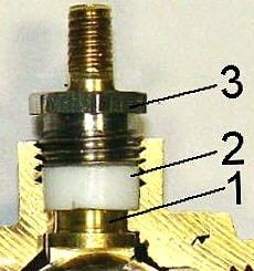 Самым надежным и практичным на сегодняшний день признан сальниковый узел с тефлоновым сальниковым кольцом 2 высотой не менее 40 % диаметра штока, прижимной сальниковой гайкой с наружной резьбой 3 и со штоком 1, вставленным изнутри (рис. 4).