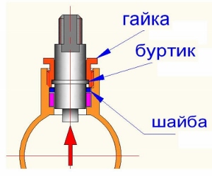 Когда шток вставлен снаружи, выталкивающую силу приходится воспринимать сальниковой гайке (рис. 7). Здесь и начинает проявляться «эффект юлы». Вибрации крана и знакопеременные температурные нагрузки приводят к самопроизвольному откручиванию сальниковой гайки и появлению течи. При отсутствии должного контроля гайка может частично выйти из резьбового зацепления. В этом случае, при малейшем скачке давления, оставшаяся в зацеплении часть резьбы будет смята, и шток будет выбит из крана.
