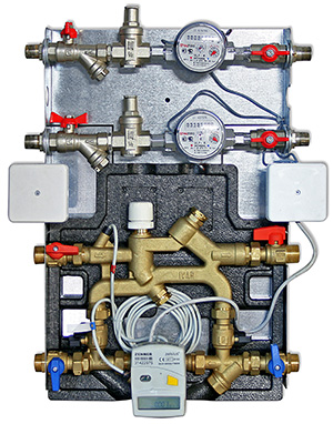 В станциях CONTROL MODUL (рис. 1) осуществляется учёт энергозатрат на отопление квартиры, учёт потребления холодной и горячей воды. К тому же в узле есть регулирующий клапан для управления системой отопления квартиры при помощи термостата, балансировочные клапаны для увязки систем отопления квартир между собой, а также широкий набор дополнительных сервисных элементов – обратный клапан, фильтр механической очистки и т.д. Также при помощи данного узла можно организовать сеть диспетчеризации для удалённого снятия показаний потребления тепловой энергии и воды квартирами.