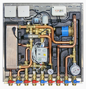 Станция CONTROL SAT (рис. 2) представляет собой индивидуальный квартирный тепловой пункт (ИТП) нового поколения. В этой станции помимо учёта тепловой энергии и воды также осуществляется приготовление воды для ГВС. Узел имеет в своём составе теплообменник, в котором осуществляется нагрев холодной воды до температуры ГВС. Данное решение позволяет дополнительно снизить энергозатраты здания на приготовление горячей воды и снизить расчётную нагрузку на систему теплоснабжения здания на 10–15 %.