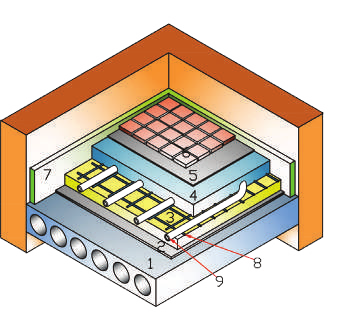 Рис. 1. Конструкция «мокрого» тёплого пола (пример): 1 – основание (плита перекрытия); 2 – пароизоляция; 3 – слой утеплителя (пенополистирол); 4 – цементно-песчаная или бетонная стяжка; 5 – клеевой слой; 6 – чистовое напольное покрытие: 7 – демпферная лента; 8 – арматурная сетка; 9 – трубы тёплого пола.
