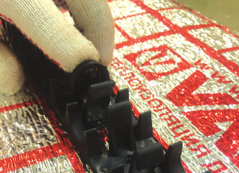 Например, шина SHM.1620 позволяет фиксировать трубы с наружным диаметром 16 и 20 мм. Она представляет собой пластиковый трак длиной 50 см. Шину можно крепить гарпунными скобами к теплоизоляции (рис. 16), а также можно монтировать на бетонное основание с помощью дюбелей. С обоих торцов шины предусмотрены замки для крепления траков между собой по длине. Ширина шины 40 мм, высота – 32 мм. Минимальный шаг укладки трубы при использовании данной шины – 50 мм. Шины SHM.1620 поставляются в упаковках по 20 шт. (10 м).