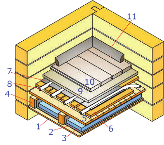 Рис. 2. Конструкция «сухого» тёплого пола (пример): 1 – подшивка по лагам; 2 – пароизоляция; 3 – слой утеплителя (пенополистирол); 4 – лаги; 5 – чёрный пол; 6 – опорные бруски; 7 – теплораспределительная пластина; 8 – трубы тёплого пола; 9 – слой ГВЛ; 10 – дощатый пол; 11 – плинтус.