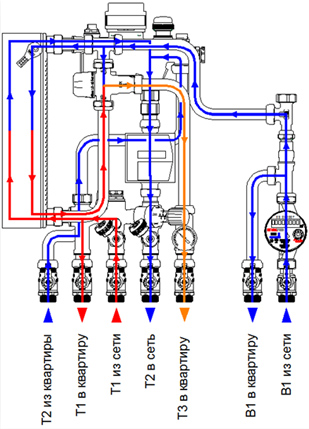 - холодная вода на входе в станцию разделяется на два потока, один идет на нужды квартиры в холодной воде, а второй – в теплообменник для последующего нагрева;