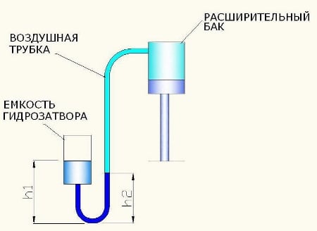 Миф 6. В открытый расширительный бак необходимо постоянно доливать теплоноситель, т.к. он интенсивно испаряется. Да, это действительно большое неудобство, но его можно легко устранить. Для этого используется воздушная трубка и гидравлический затвор, устанавливаемый, как правило, ближе к нижней точке системы, рядом с котлом (рис. 8). Такая трубка служит воздушным демпфером между гидравлическим затвором и уровнем теплоносителя в баке, поэтому, чем больше ее диаметр, тем лучше. Тем меньше будет уровень колебаний уровня в бачке гидрозатвора. Некоторые умельцы умудряются закачивать в воздушную трубку азот или инертные газы, тем самым предохраняя систему от проникновения кислорода.